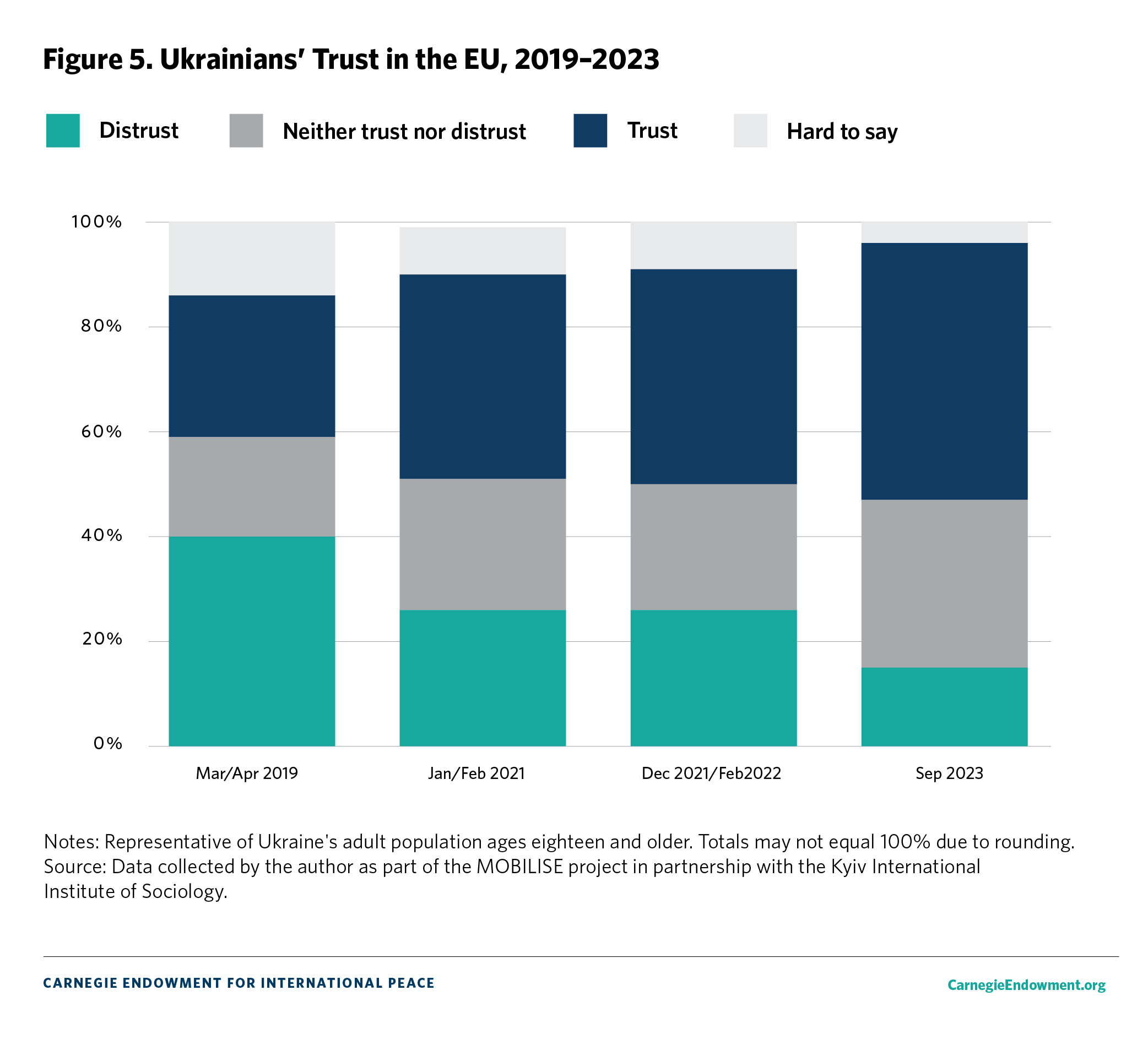 Ukrainians’ desire to join the EU does not always mean that they trust the union and its institutions. More Ukrainians support joining the EU than trust it. Back in 2019, 40 percent distrusted the union completely or somewhat. Yet, just before the start of Russia’s all-out war, the sentiment flipped to 41 percent of Ukrainians trusting the EU. And by September 2023, this number had risen to nearly 50 percent (see figure 5). This outlook has not only persisted but also strengthened during the ongoing conflict, again suggesting the war’s rallying effect and a clear delineation from the Russian autocratic model of governance. Moreover, these data highlight a deep-rooted belief among Ukrainians that their future—and, indeed, their identity—is intrinsically linked to Europe and its democratic ethos.
