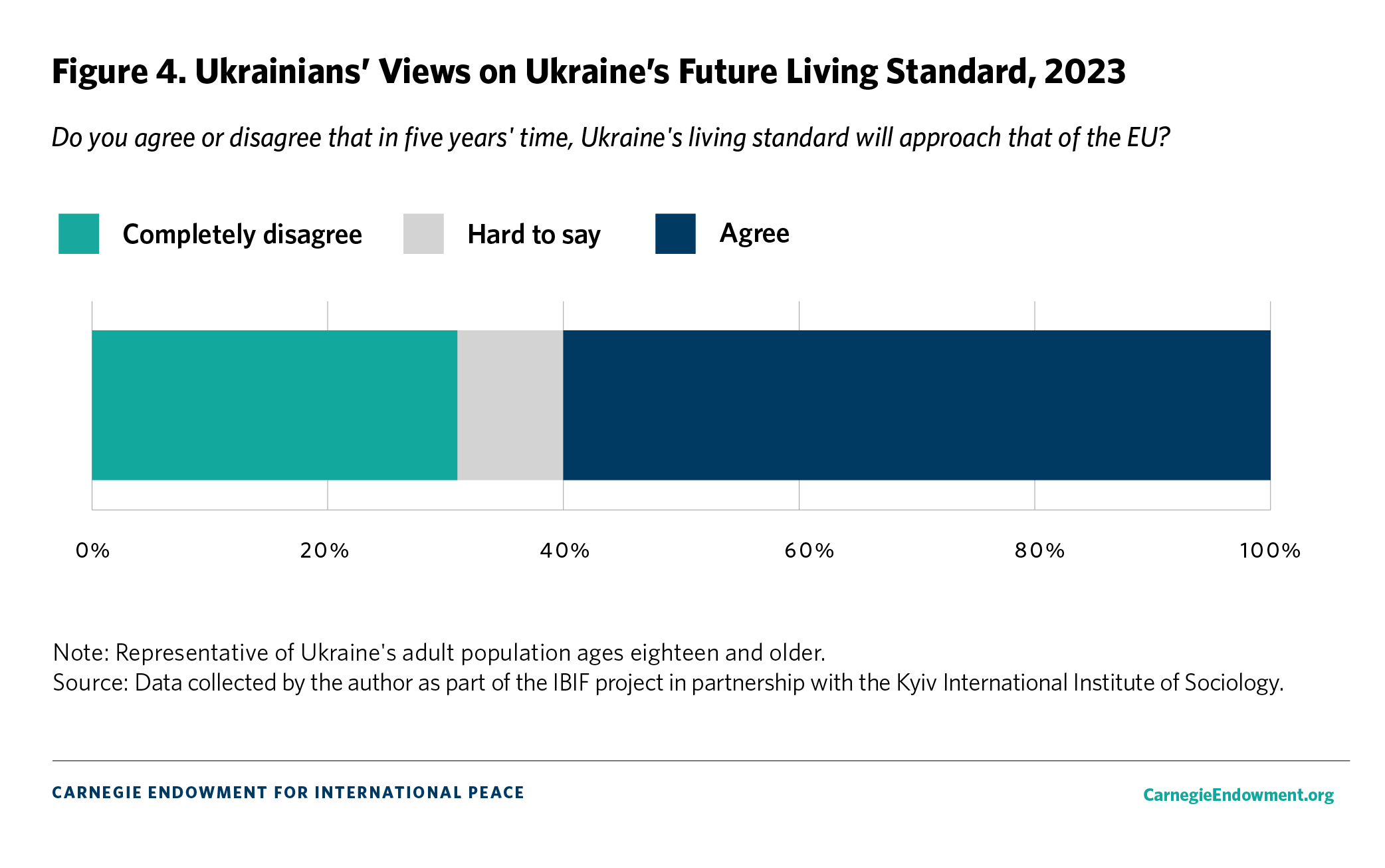 What is more, amid prolonged conflict and the challenges of a seemingly slow-moving offensive campaign that has led foreign analysts to question Ukraine’s resolve, Ukrainians have an optimistic vision of their future, which is closely tied to their European aspiration. In what might come as a surprise to some, the IBIF project found in August 2023 that two-thirds of the population believed that Ukraine’s standard of living would converge with that of the EU within the next five years (see figure 4). This sentiment transcends mere hope and indicates a deep-seated conviction in the transformative power of European integration and in Ukraine’s place in the EU.