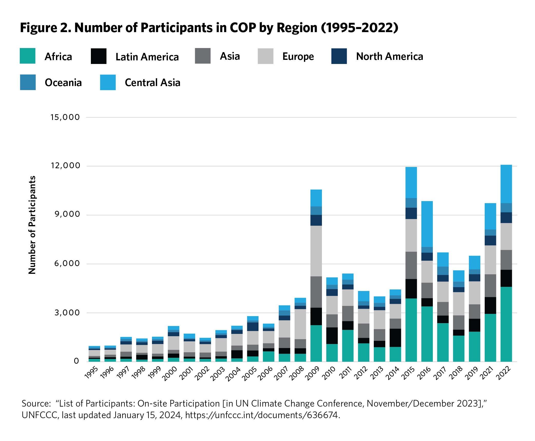 In general, delegation size has increased since 1995. However, there were significant spikes in 2009 and 2015, when landmark agreements were adopted in Copenhagen and Paris. Intersessional meetings throughout the year and publicized meetings between world leaders (such as the meetings between then U.S. president Barack Obama and Chinese Premier Xi Jinping before COP21 in 2015) can tip off countries, civil society, and the media that important decisions will be made at that year’s conference. This can build momentum and, subsequently, prompt a larger turnout. COP22 (in 2016) and COP27 (in 2022) were also highly attended, in part because attendees sought to follow up on the implementation of agreements made in the previous years.