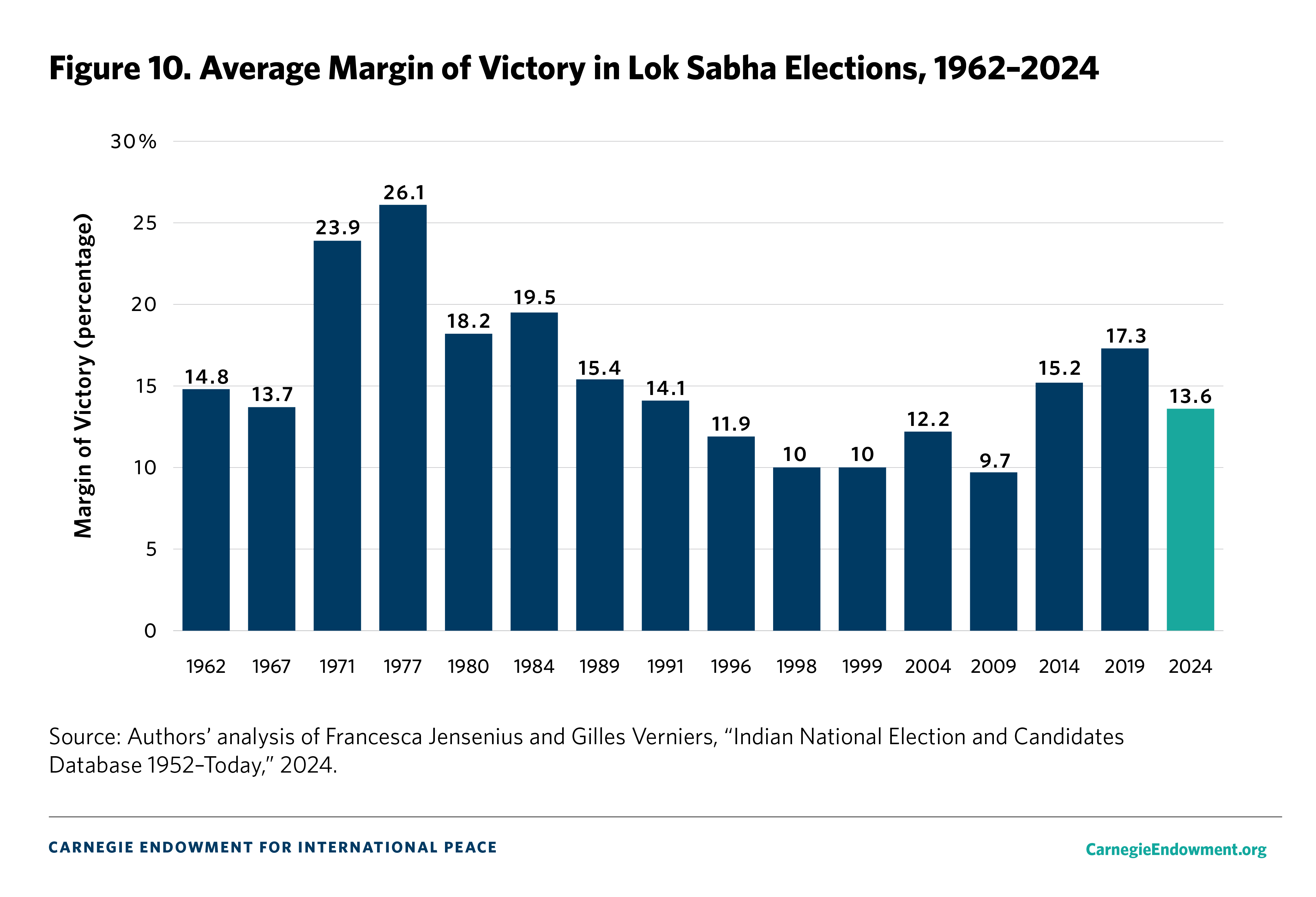 With the BJP’s rise to power in 2014, this trend sharply reversed, with the average margin touching 15.2 percent. By 2019, it had grown to 17.3 percent, signifying that constituency-level elections had become appreciably less competitive in the fourth party system. Based on this measure, 2024 marks another partial reversal as the average margin fell to 13.6 percent—higher than every election since 1991 but a twenty percent decline from 2019 levels.