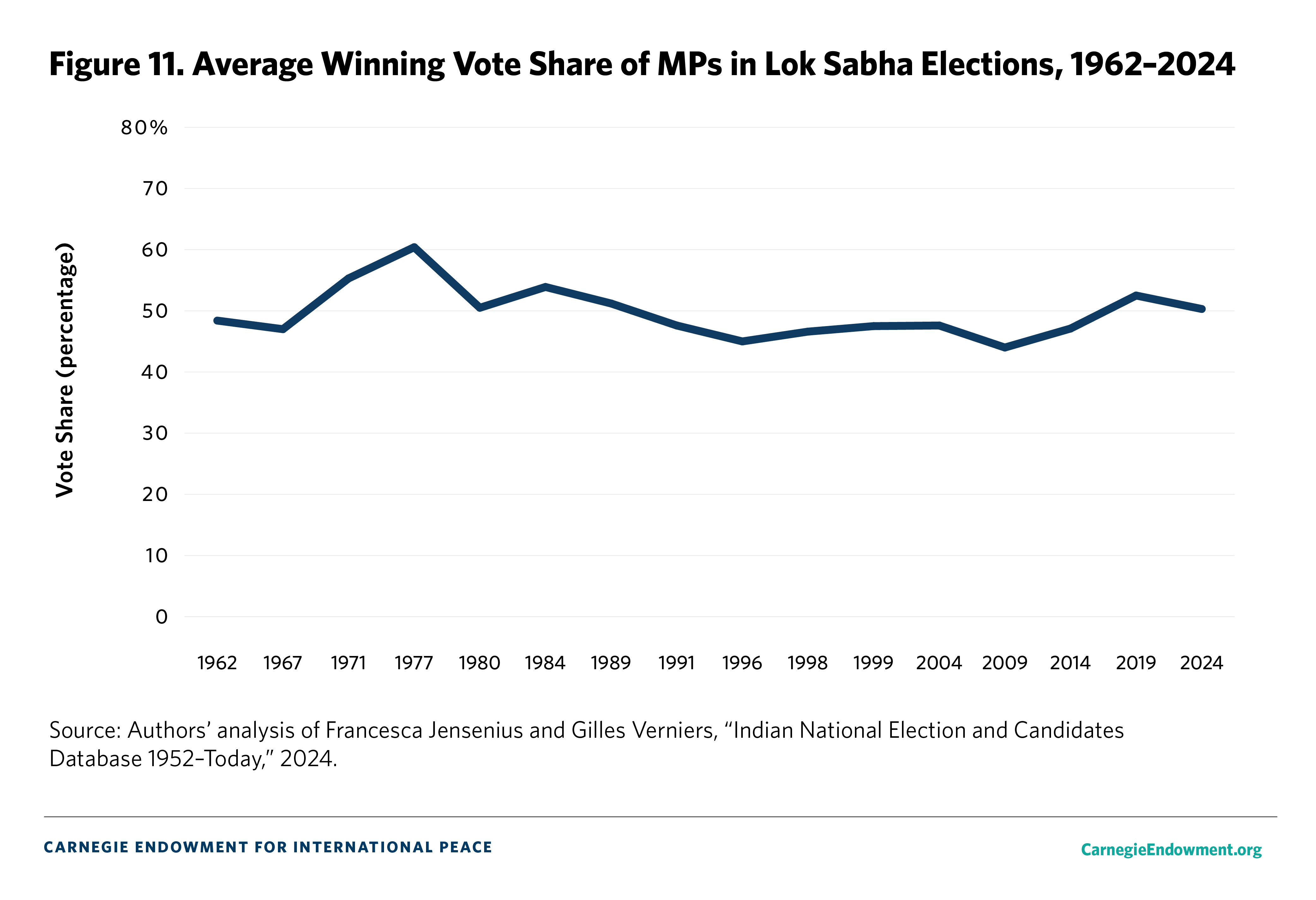 Another way of measuring competition is to calculate the vote share of the winning candidate (see figure 11). In India’s first-past-the-post system, the candidate who earns the most votes in a constituency wins the seat, irrespective of whether they win a majority of votes. Indeed, given that there are typically more than two competitive candidates in a constituency, it is not uncommon for the winning candidate to secure far less than fifty percent of the total votes cast.