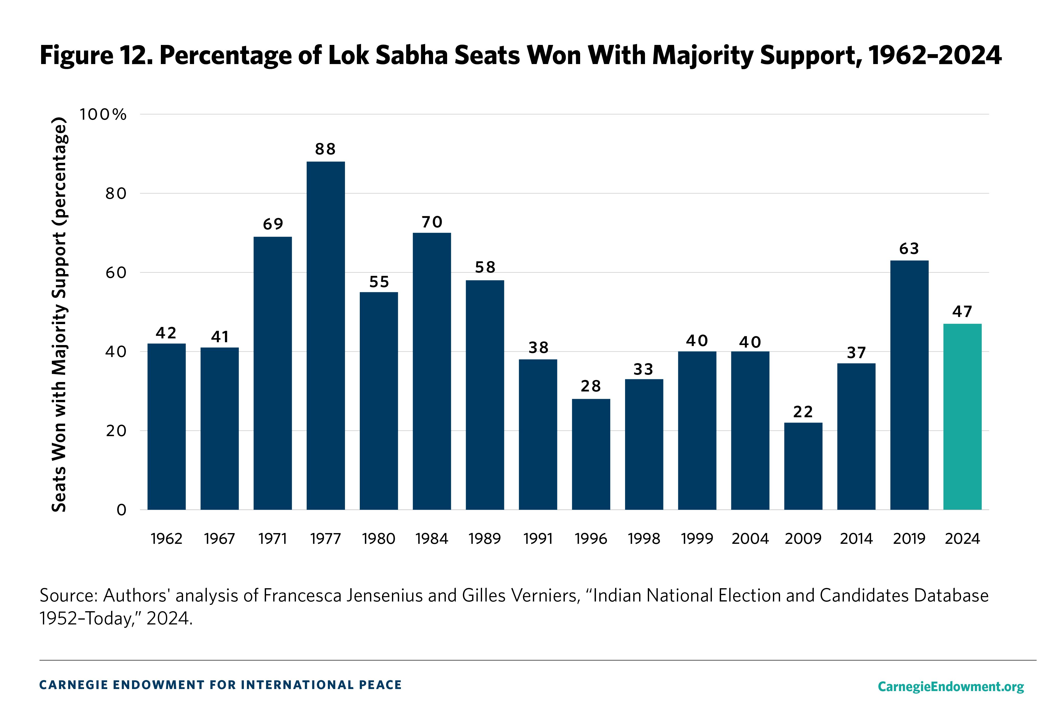 As one might expect, the share of Lok Sabha seats won with majority support exhibits a similar trend (see figure 12). Only 22 percent of MPs won their seats with more than 50 percent of the vote in 2009—a precipitous decline from 40 percent in 2004. This share rose to 37 percent in 2014 and a stunning 63 percent in 2019. In line with the data on average winning vote share, this figure fell to 47 percent in 2024—a decline but still the second-highest proportion since 1989.