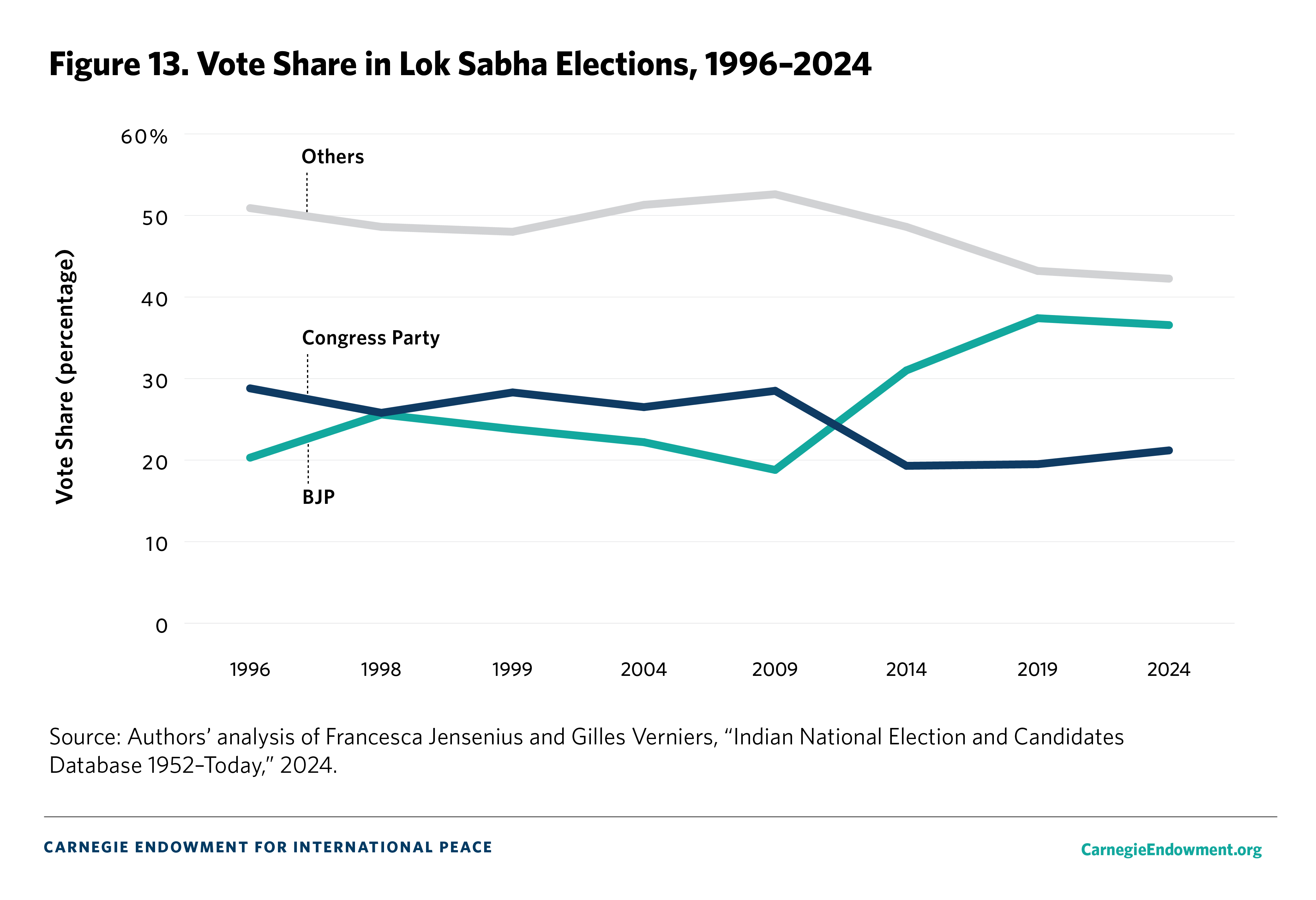 As for the opposition, the Congress Party contested the fewest seats in a general election in its history, a calculated decision taken in deference to a slew of coalition partners.35 In a state like Uttar Pradesh, where the Congress Party has long witnessed a decline in its popular appeal, the party’s seat-sharing arrangement with the Samajwadi Party (SP) undoubtedly lifted its own numbers. In 2019, the Congress Party contested the state on its own, winning 6.4 percent of the vote and capturing just 1 of the state’s 80 parliamentary seats. In 2024, fighting alongside the SP, the Congress Party notched 9.5 percent of the vote and won six seats.36 Although observers cannot fully separate the national parties’ popular appeal from that of regional parties (and vice versa), it is clear that the roughly equitable breakdown in vote share between national and regional parties has tilted in favor of the former.