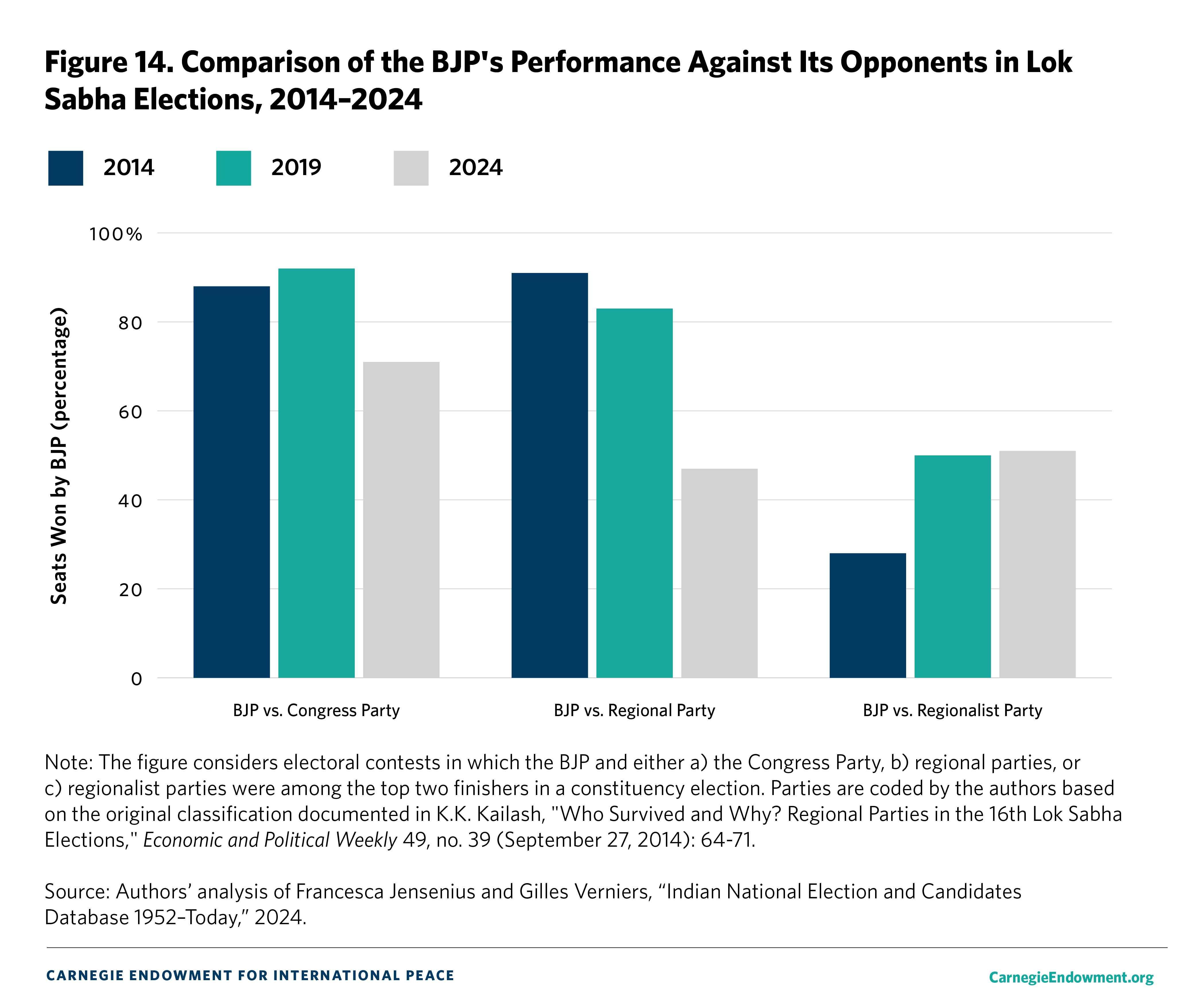 The trends in 2024 deviated from the established pattern of the last decade. The BJP continued to match up relatively well with the Congress Party, though, with a 71 percent strike rate, it performed much less well than in 2014 or 2019. The BJP’s performance against regional parties vastly underperformed its prior showings, with the ruling party winning in fewer than half (47 percent) of all direct contests. But the BJP held its own vis-à-vis regionalist parties, clinching 51 percent of all head-to-head fights. Taken together, these facts are in line with the overall shift in geographic support for the BJP in the recent general election.