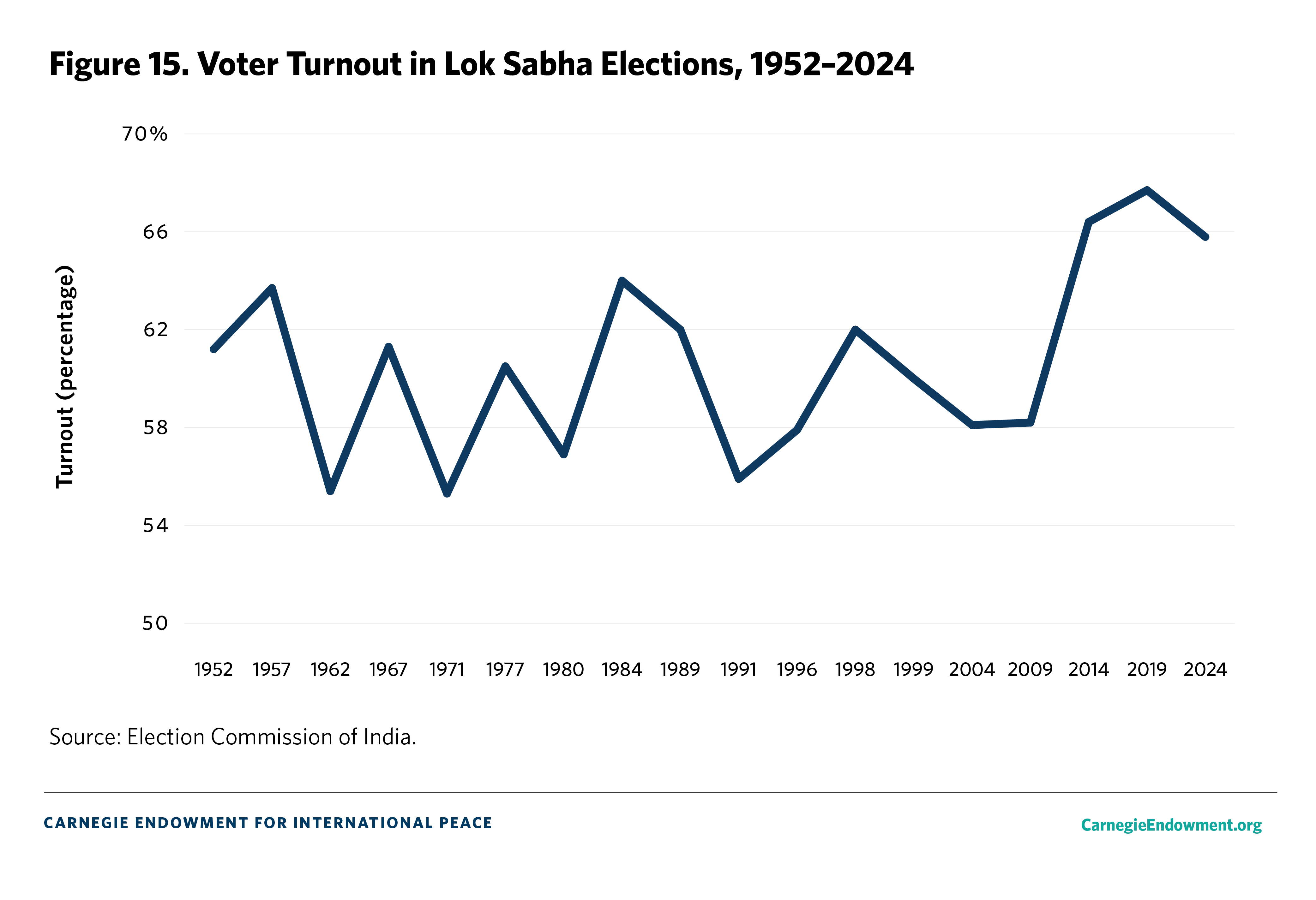 Much of the commentary ahead of the 2024 elections featured a narrative of sagging voter turnout.39 While turnout did indeed drop in the aggregate, the decline was modest: overall turnout stood at 65.8 percent in 2024, a little over half a percentage point smaller than the corresponding 2014 figure. Given two successive elections with record-breaking turnout and an election that lacked a defining issue, some mean reversion should not come as a surprise. By historical standards, general election turnout in India remains elevated. Averaging across the 2014, 2019, and 2024 elections, turnout was 66.6 percent—seven and a half percentage points higher than during the third party system (1989–2009).