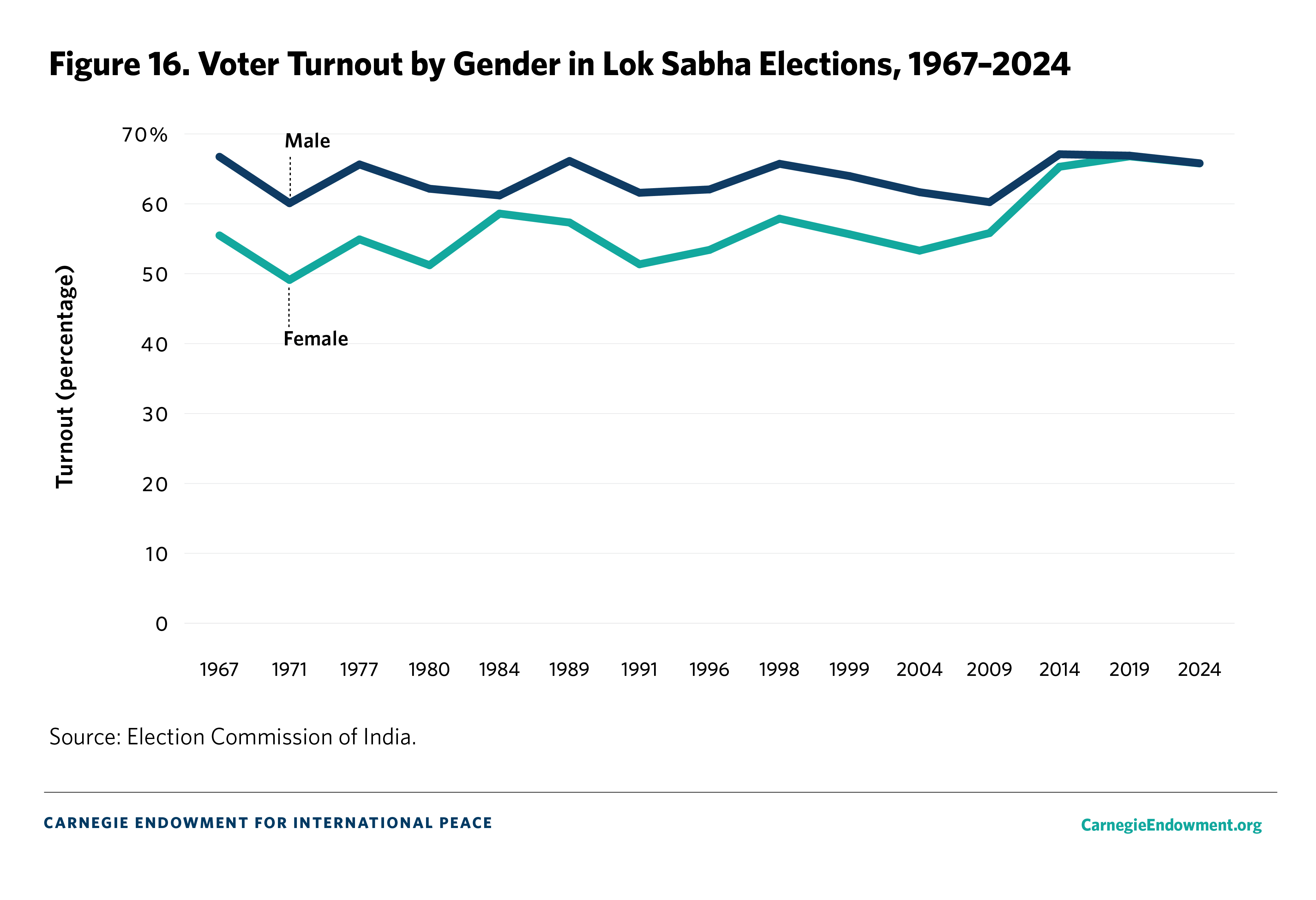 A second dynamic that came into view during the end of the third party system and the advent of the fourth party system does not pertain to overall turnout levels but to the composition of who comes out to vote.40 In the first several decades after independence, female turnout consistently lagged male turnout by 8 to 12 percentage points (see figure 16). In 2004, the male-female turnout gap stood at 8.4 percent. Five years later, that gap nearly halved to 4.4 percent. In 2014, the gap shrunk further to 1.8 percent, and by 2019, it virtually disappeared (to a miniscule 0.1 percent). In 2024, the gender gap in turnout was virtually wiped out, at just 0.02 percent.