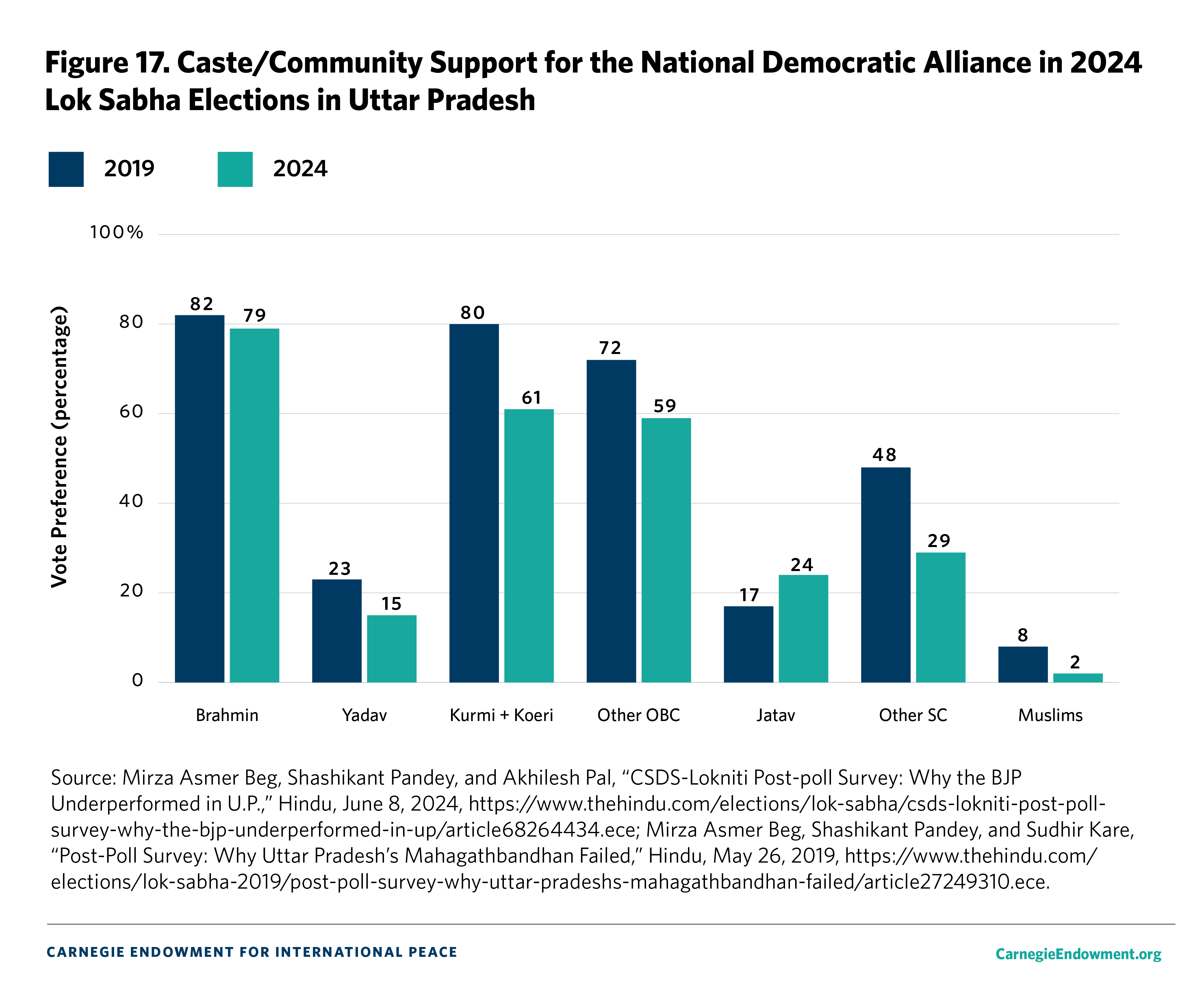 In 2024, this remained the BJP’s strategy in northern India, but it proved far less effective. Consider the caste- and community-level data on voting patterns in Uttar Pradesh that emerged from the National Election Study carried out by Lokniti-CSDS (see figure 17).45 The BJP lost ground among non-Yadav OBCs and non-Jatav Dalits (with large numbers of these voters moving to the opposition INDIA alliance). Interestingly, the BJP made up some ground with Jatavs, though this is likely explained by the electoral collapse of the BSP, whose base has long consisted of Jatav voters. Indeed, even in 2024—a historically abysmal election year for the BSP—44 percent of Jatav voters in Uttar Pradesh continued to back the party.46
