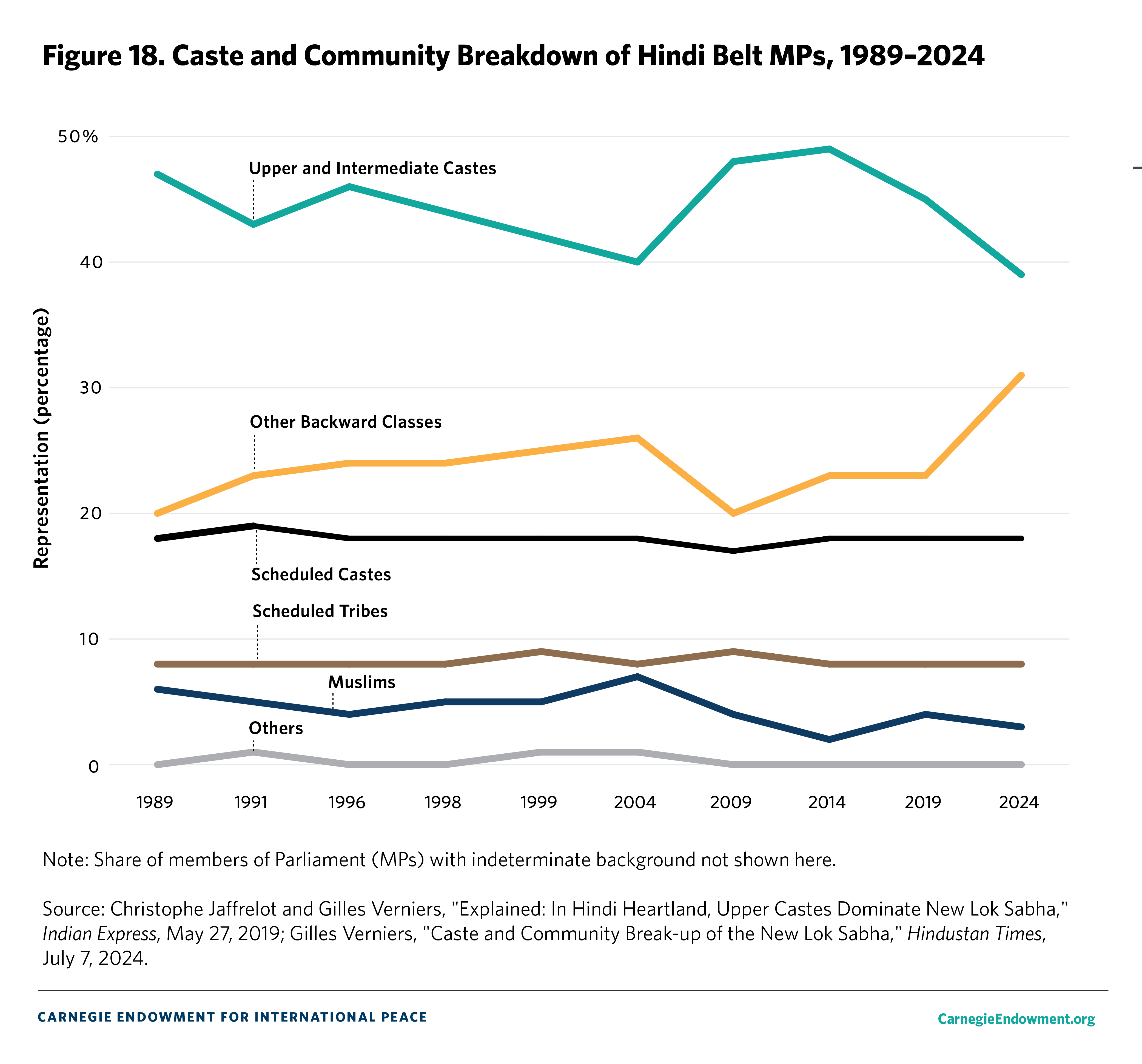 Christophe Jaffrelot and Gilles Verniers, “The Reconfiguration of India’s Political Elite: Profiling the 17th Lok Sabha,” Contemporary South Asia 28, no. 2 (2020): 242-54; and Christophe Jaffrelot and Gilles Verniers, “Explained: In Hindi Heartland, Upper Castes Dominate New Lok Sabha,” Indian Express, May 27, 2019, https://indianexpress.com/article/explained/in-hindi-heartland-upper-castes-dominate-new-house-5747511/.