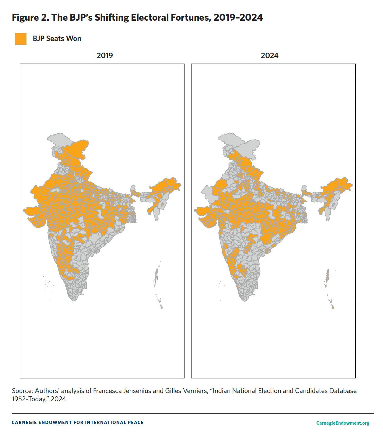 Whereas the BJP saw its vote share decline in its traditional bastion, the Hindi heartland (the clutch of predominantly Hindi-speaking states stretching from Rajasthan in the west to Bihar in the east), its vote share increased in eastern and southern states—areas where it has traditionally been much weaker given the dominance of regional parties (see figure 2 for a visual demonstration of the BJP’s changing geographic footprint).14