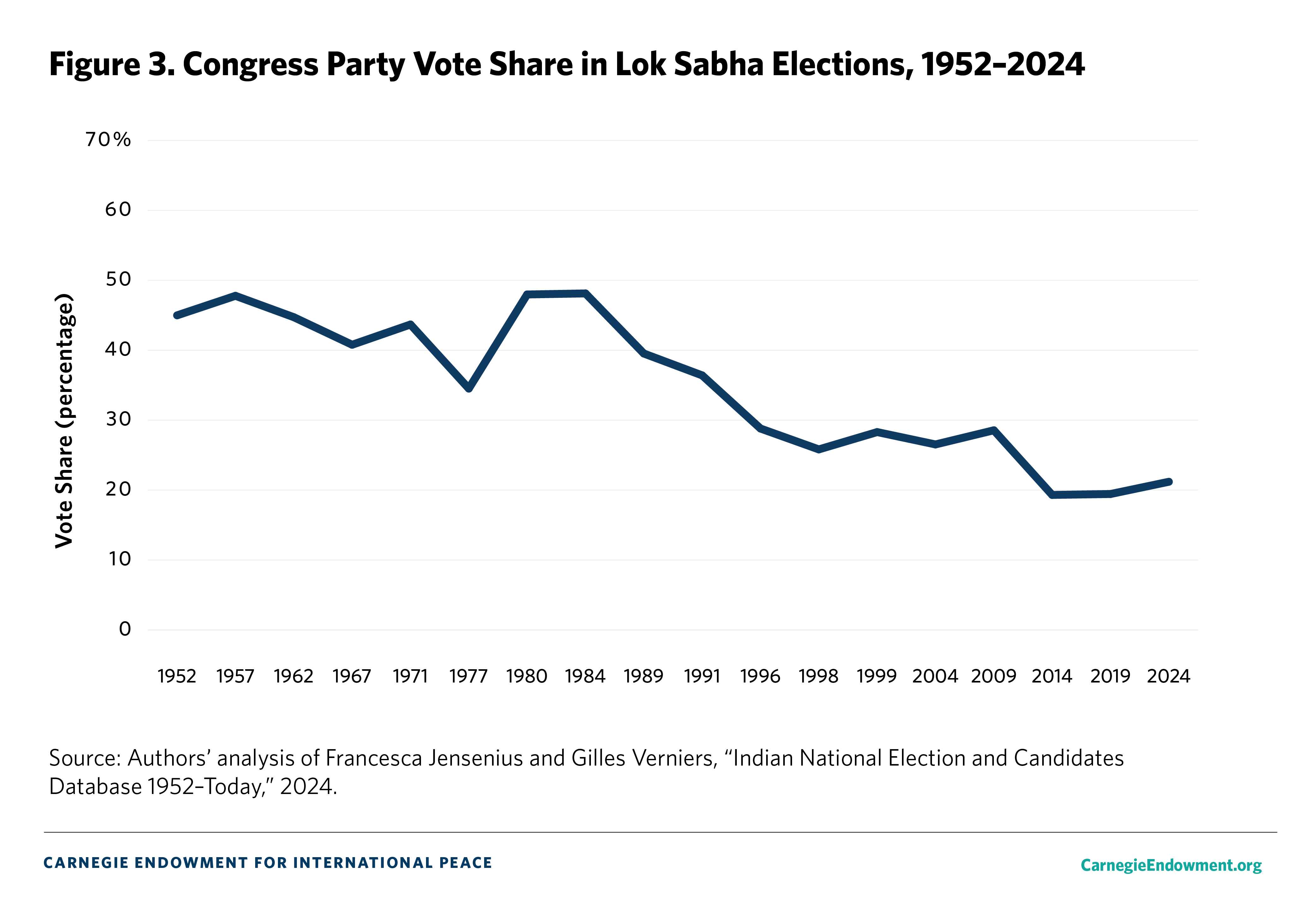 The Congress Party’s performance in 2024 looks better if one restricts attention to those seats that the Congress Party contested, keeping in mind that the party fielded candidates in the smallest number of constituencies since 1952. According to one analysis, the Congress Party’s vote share increased by 9.8 percentage points compared to 2019 in this subset of constituencies. See Yogendra Yadav, Rahul Shastri, and Shreyas Sardesai, “7 Myths About Congress Have Been Busted by the 2024 Election Results,” ThePrint, June 12, 2024, https://theprint.in/opinion/7-myths-about-congress-have-been-busted-by-the-2024-election-results/2128516/.
