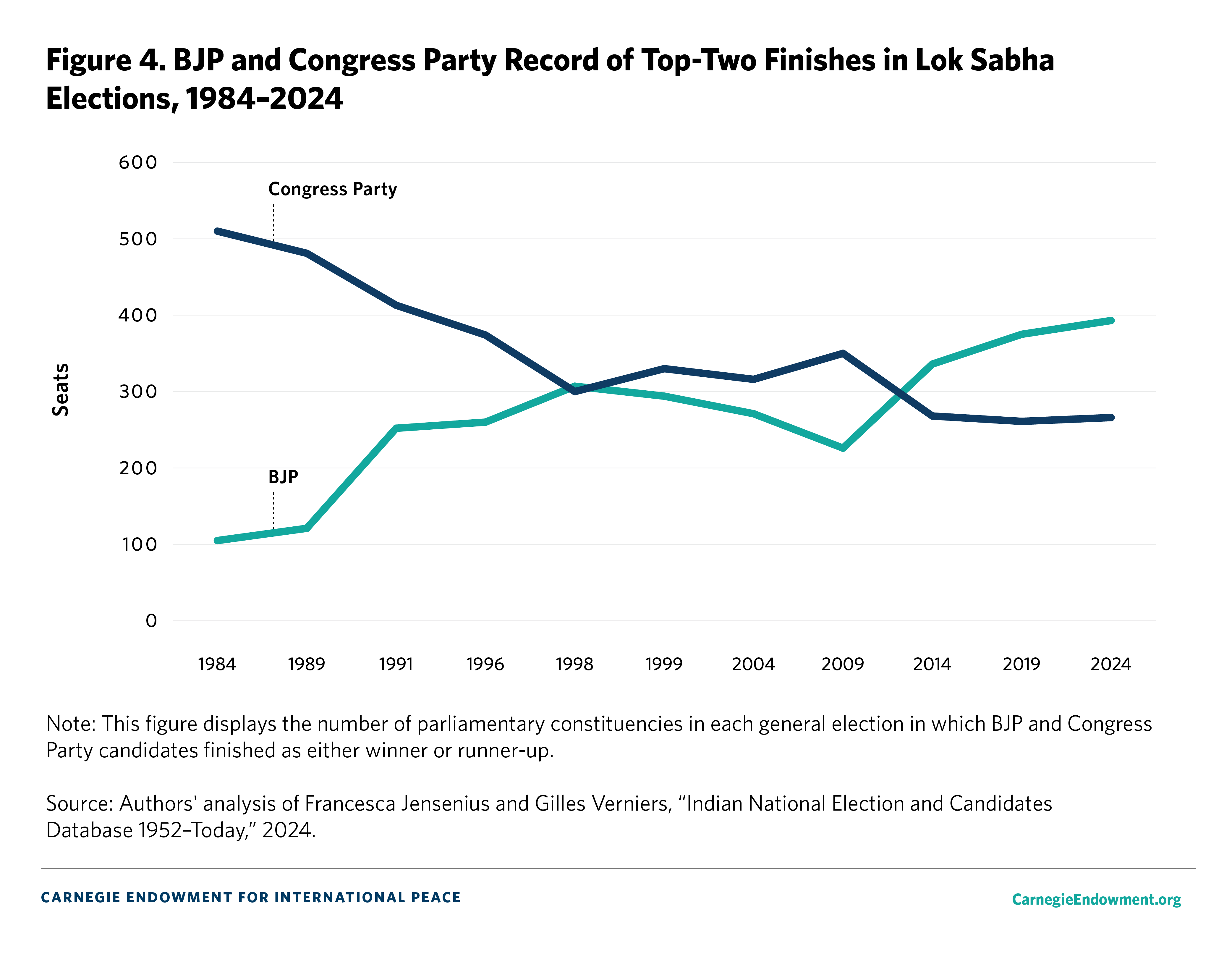Although the BJP failed to meet both internal and external electoral expectations in 2024, it did emerge as a truly pan-Indian party for the first time in its history. In 2019, the BJP fielded candidates in 436 parliamentary constituencies, compared to 421 for the Congress Party. In 2024, the BJP fielded candidates in 441 constituencies, a new record. The Congress Party, in turn, contested 328 seats—the first time since independence that it fielded candidates in less than 400 seats and a clear sign that the party recognized it must cede greater space to regional partners. Of the 441 seats the BJP contested, it emerged as either the winner or runner-up in 393 instances—an all-time high for the party (see figure 4). The Congress Party was a top-two finisher in 266 seats, roughly on par with its performance in 2014 (268) and 2019 (261).