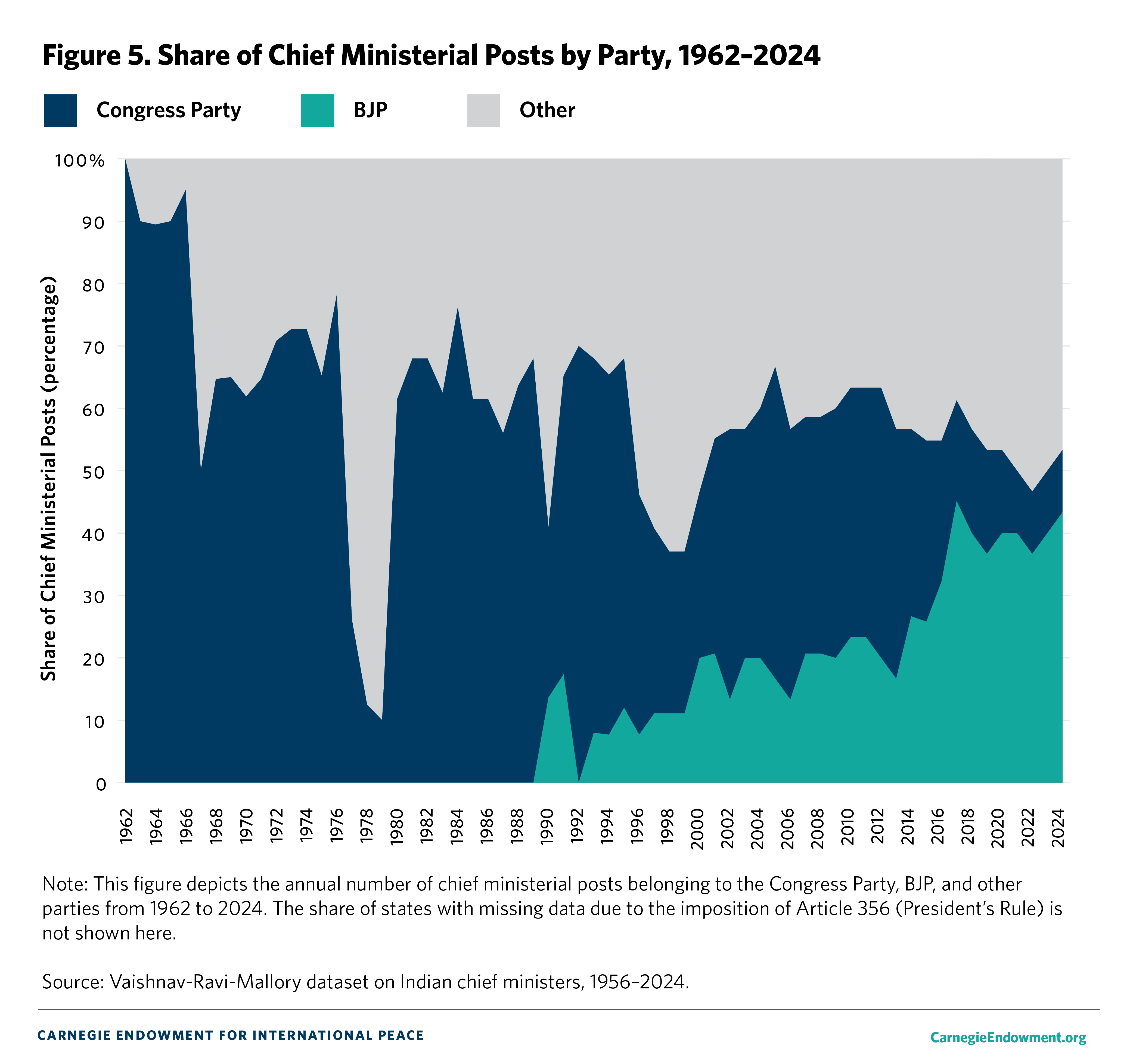 Another way of assessing the BJP’s centrality is to look beyond the national stage and focus instead on the party’s performance at the state level (see figure 5). In India’s federal setup, states—not the central government in New Delhi—have jurisdiction over the most crucial aspects of day-to-day governance that affect their constituents. At the time of writing (September 2024), BJP chief ministers are in office in thirteen states (about 43 percent of all chief ministerial positions). This share fluctuated between 37 and 43 percent over the past five years. At the end of 2013, the year before Modi first came to power, the BJP held only 17 percent of all chief ministerial positions. Since 2016, it has consistently held at least twice as many posts. The current BJP share was last matched by the Congress Party in 2012, when the latter controlled thirteen chief ministerial posts.