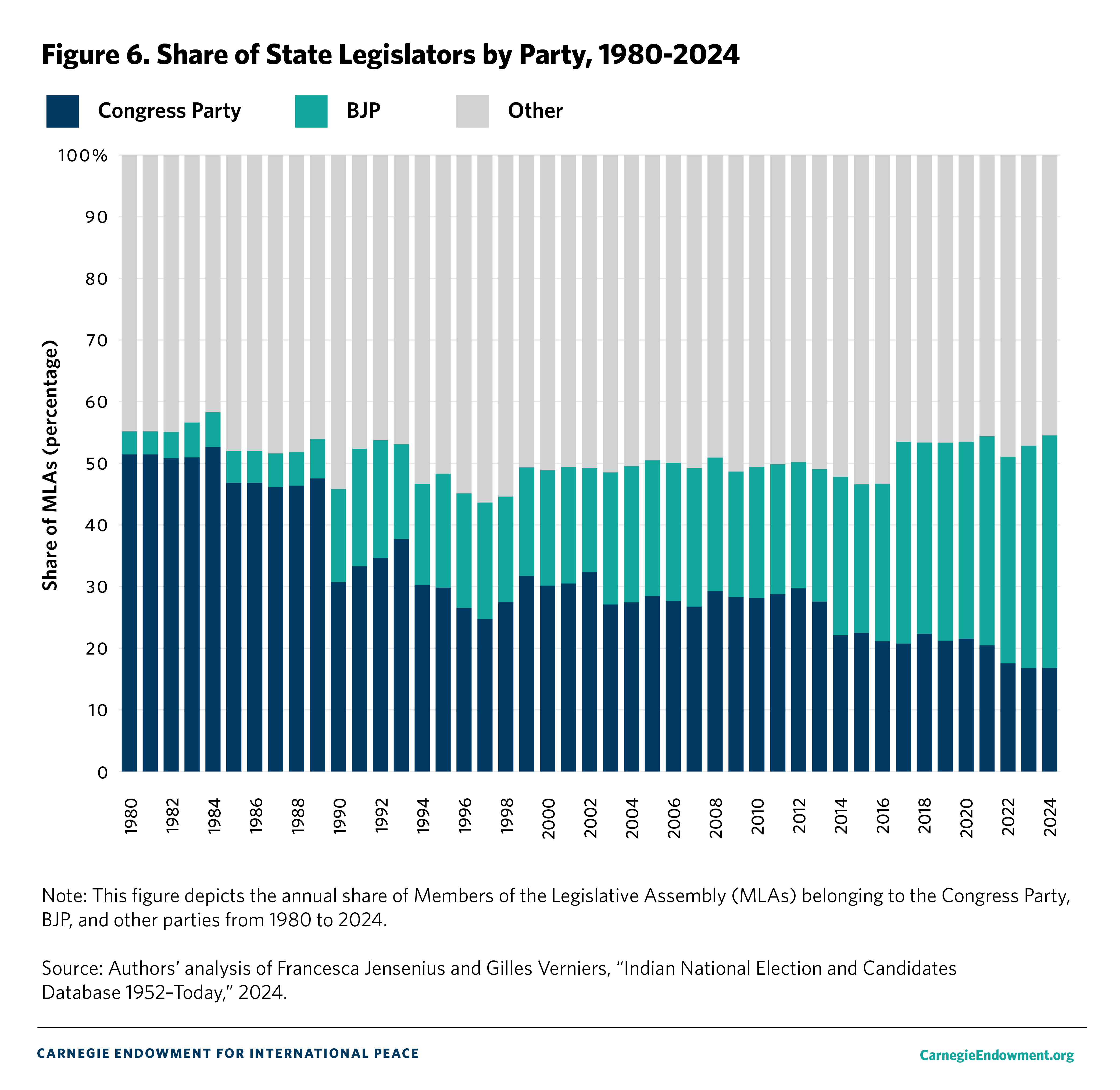 The BJP’s control of state governments has meant that its share of state legislators—or members of the legislative assemblies (MLAs)—has exhibited a corresponding increase (see figure 6). In 1980, just 4 percent of MLAs across India belonged to the BJP. That figure grew to 22 percent in 2004, during the final year of Vajpayee’s tenure.