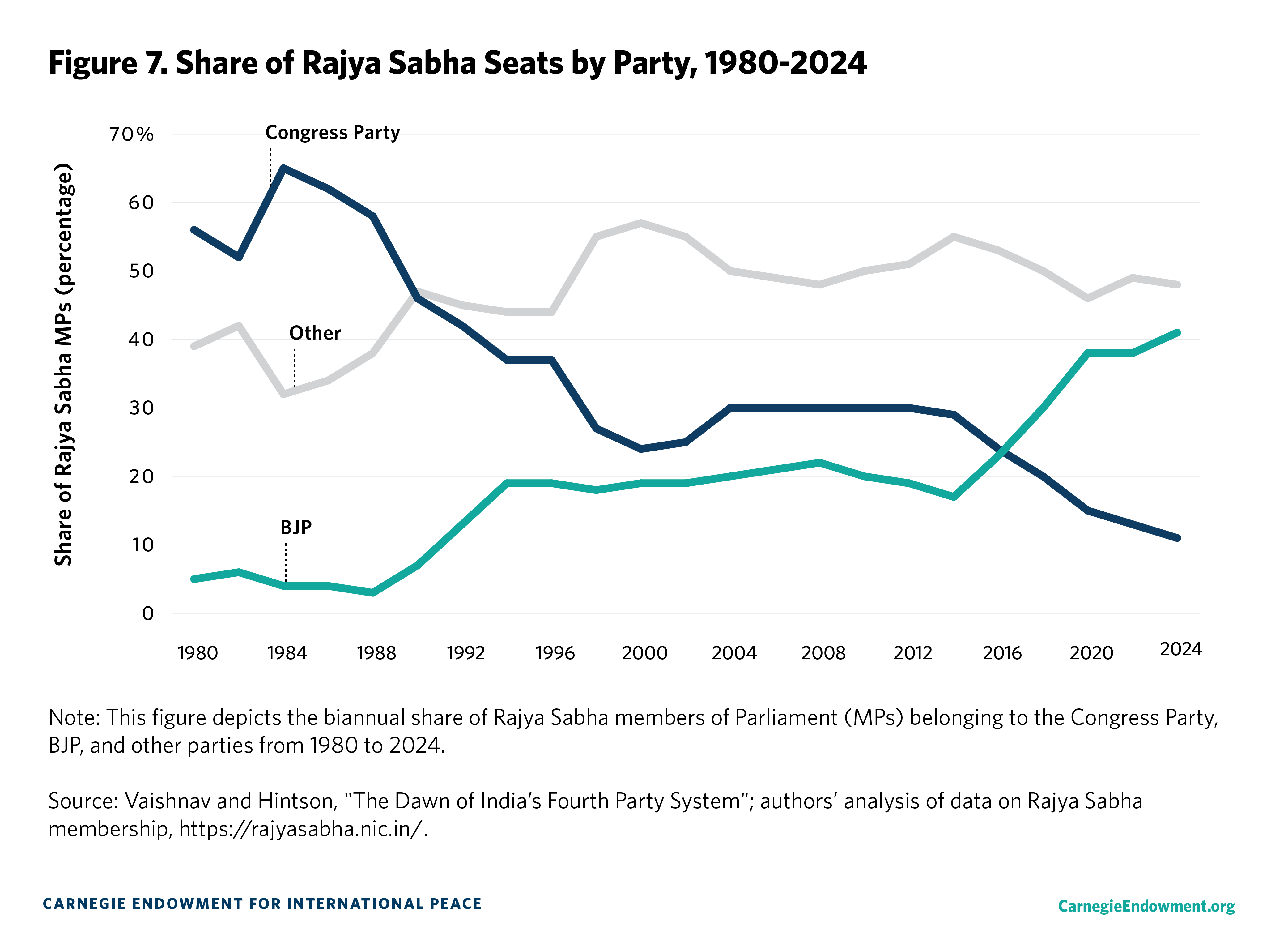 A final indicator of the BJP’s systemic import comes from data on membership from India’s upper house of parliament. The Rajya Sabha has a maximum of 245 members, 233 of which are indirectly elected by the state assemblies to serve staggered six-year terms. The other 12 members are appointed by the president based on their contributions to art, literature, science, and social service. These nominated members are allowed to affiliate with political parties within six months of their selection. Every two years, roughly one-third of Rajya Sabha terms expire and new members of Parliament (MPs) are selected. Because nearly all Rajya Sabha MPs are chosen by state legislatures, they are a proxy for a party’s subnational strength.