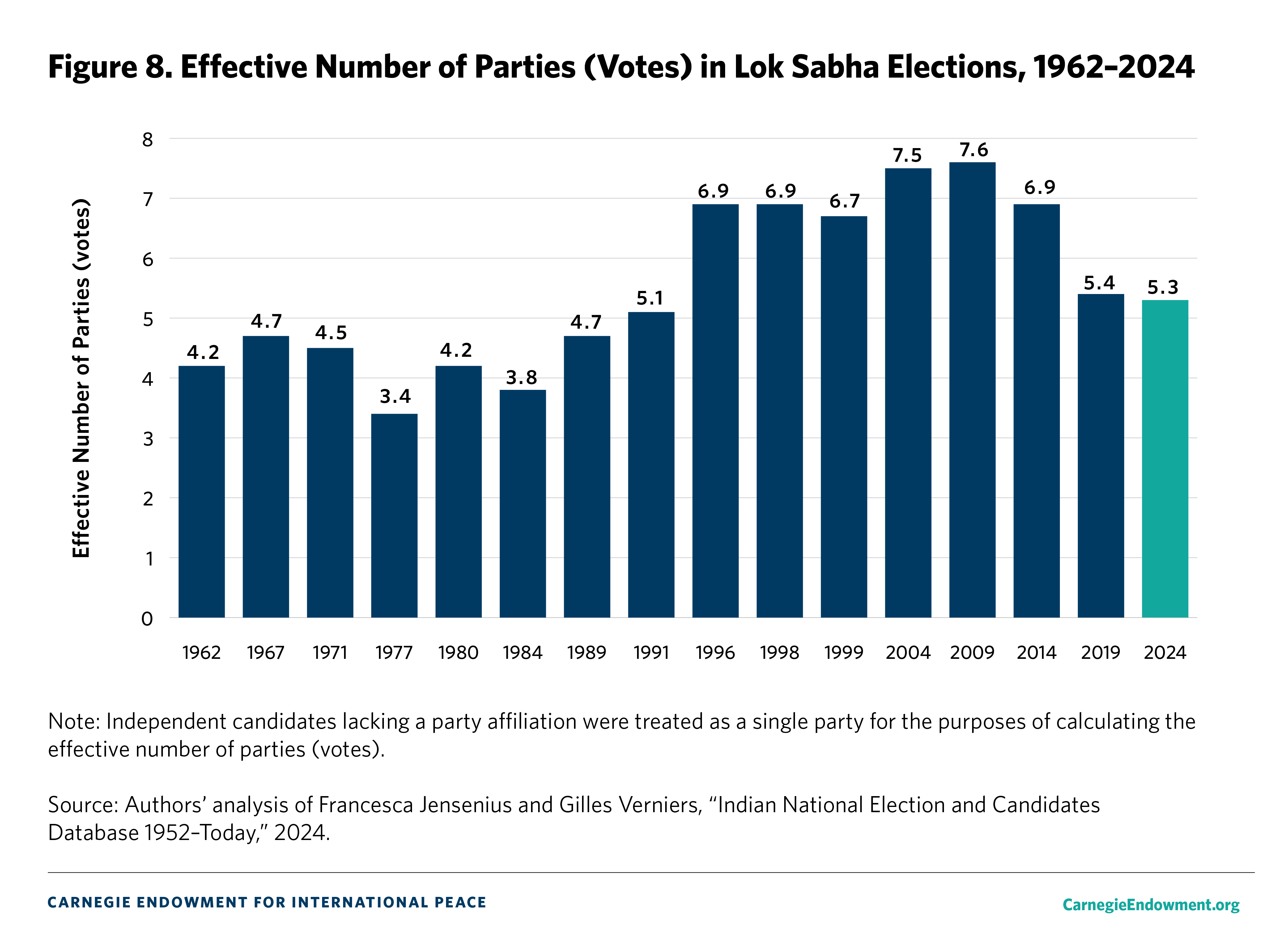 For this reason, political scientists do not usually look at the absolute number of parties fielding candidates or even the subset of those with a presence in the legislature. Instead, they prefer to calculate the effective number of parties (ENP), a measure that weighs parties by the number of votes (or seats) they actually earned.25 In practice in India, this means the effective number of parties mechanically declines during eras of dominant party rule (see figure 8).