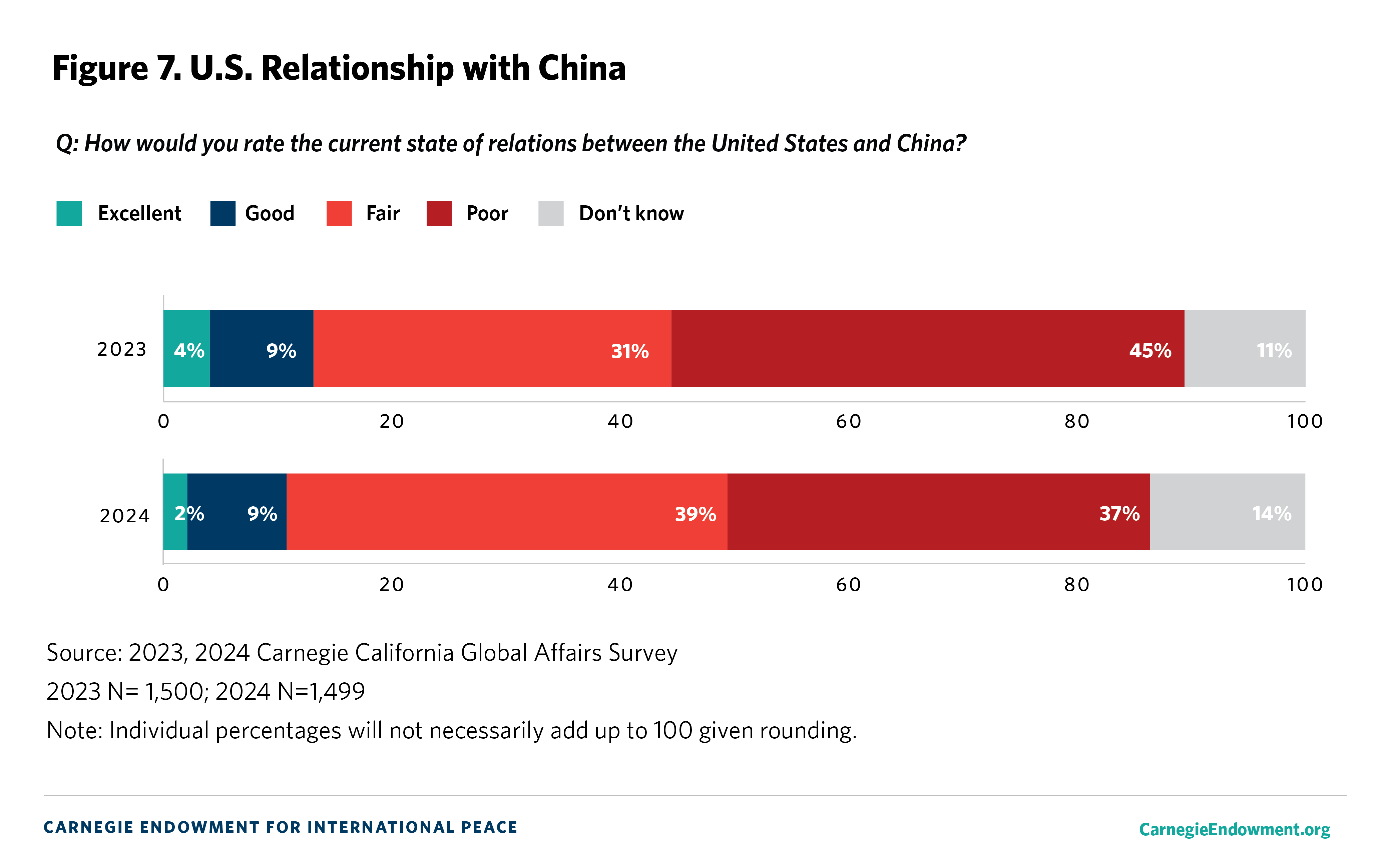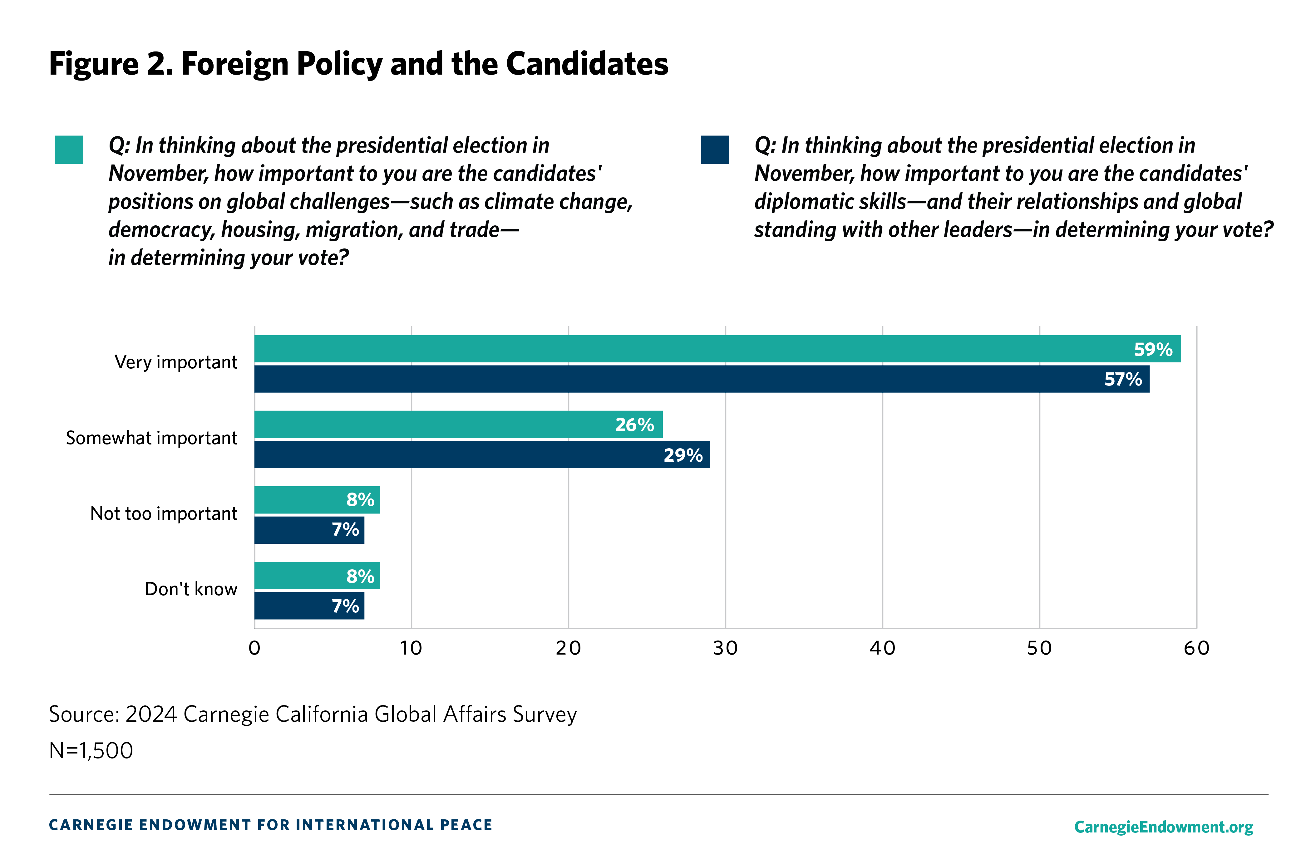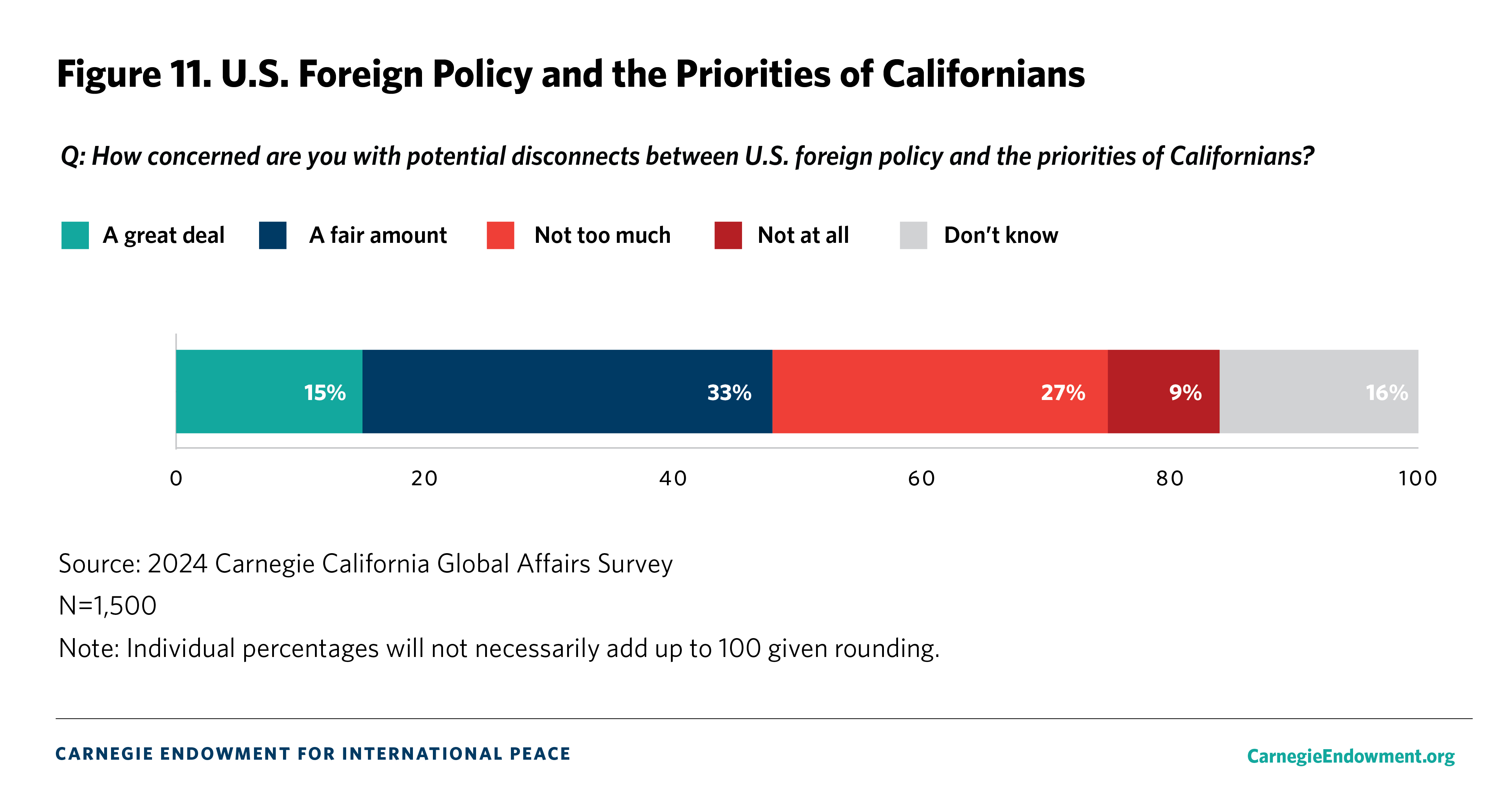 The overall margin of error is +/- 3.5 percent. The margin of error is calculated at the 95 percent confidence interval. We compare current Carnegie California Global Affairs Survey results to the 2023 Carnegie California Global Affairs Survey which was conducted with the same methodology and a number of national and regional surveys.1 The latter include surveys from the Chicago Council on Global Affairs (2023),2 Pew Research Center (2022),3 the Public Policy Institute of California (2001),4 the Carnegie Endowment for International Peace (2022 and 2023),5 and Gallup (2024).6