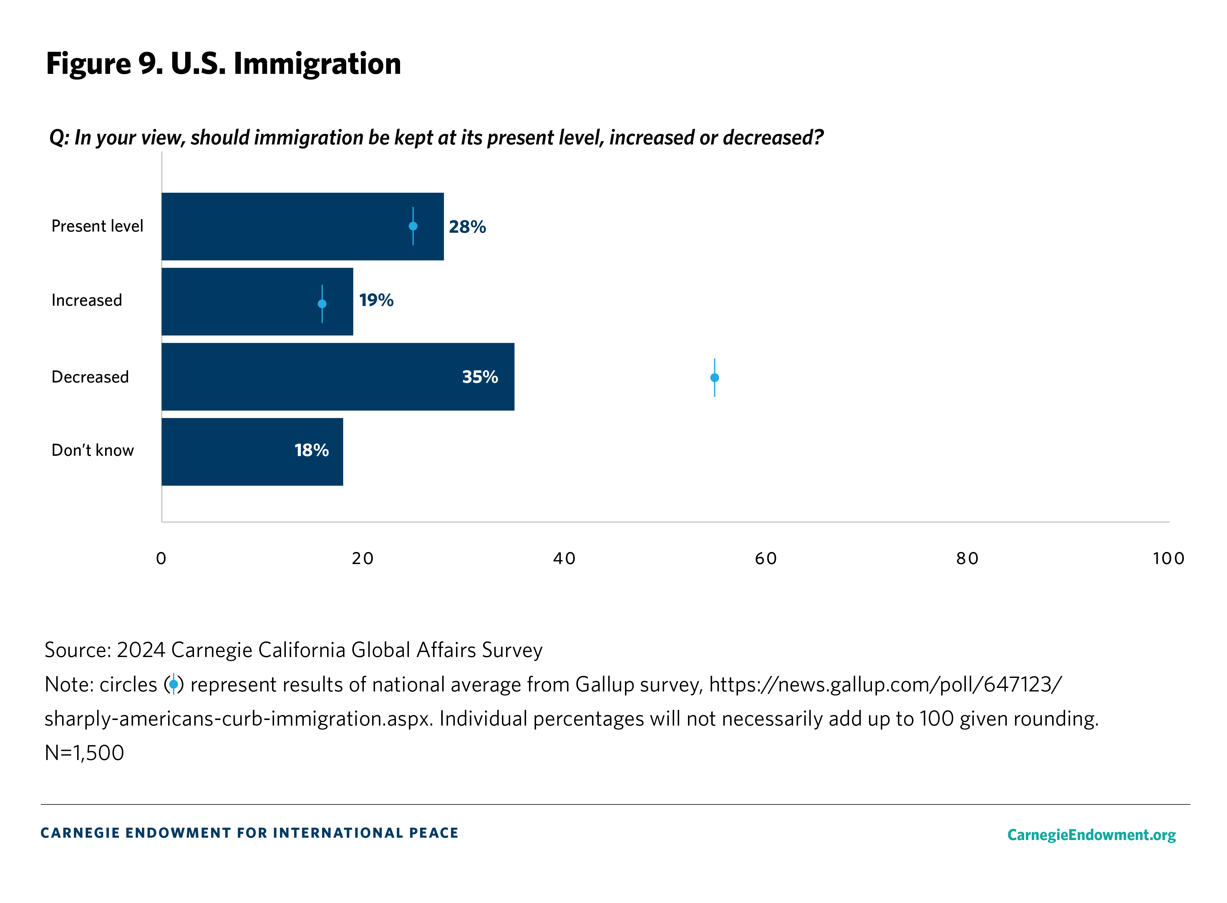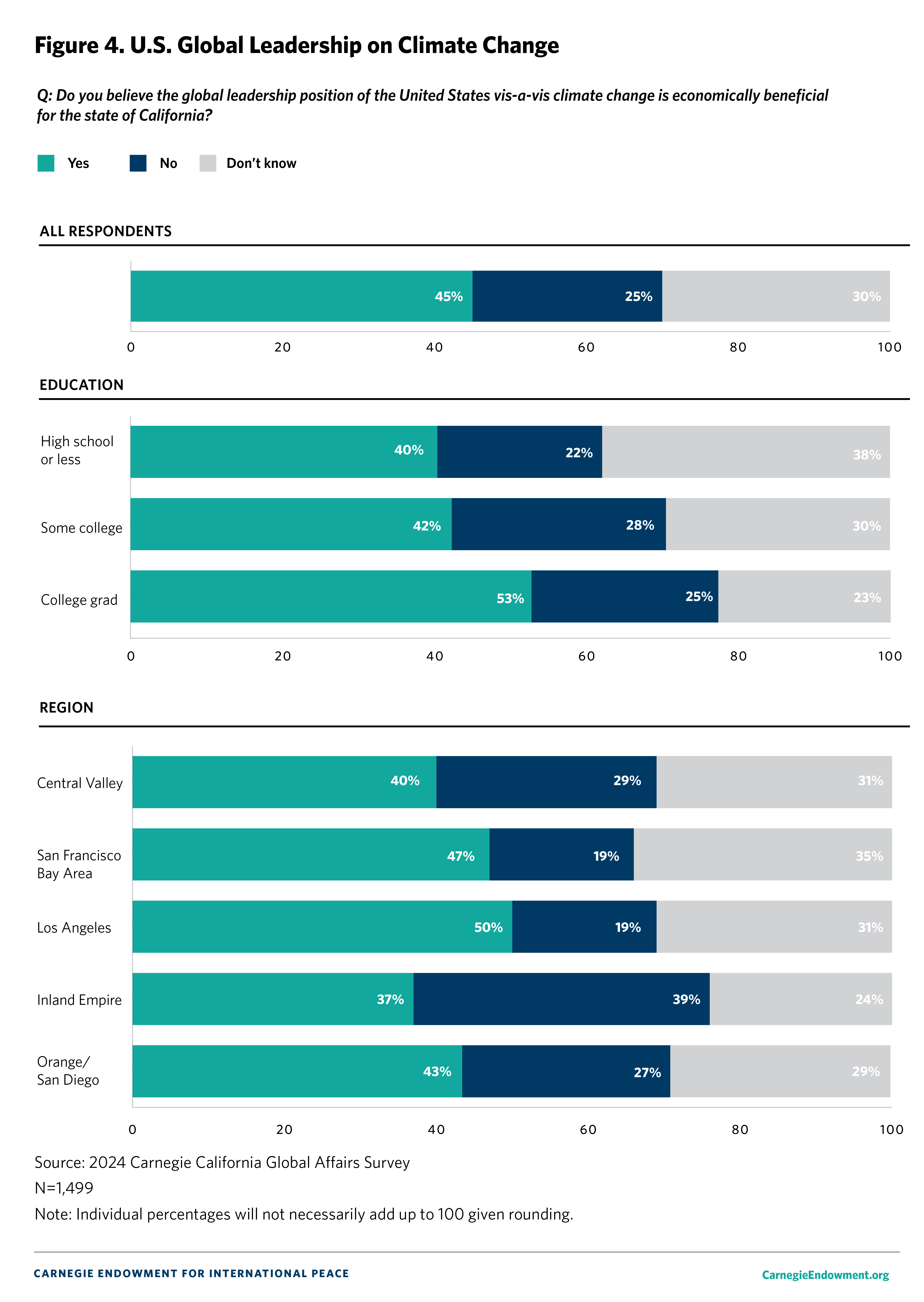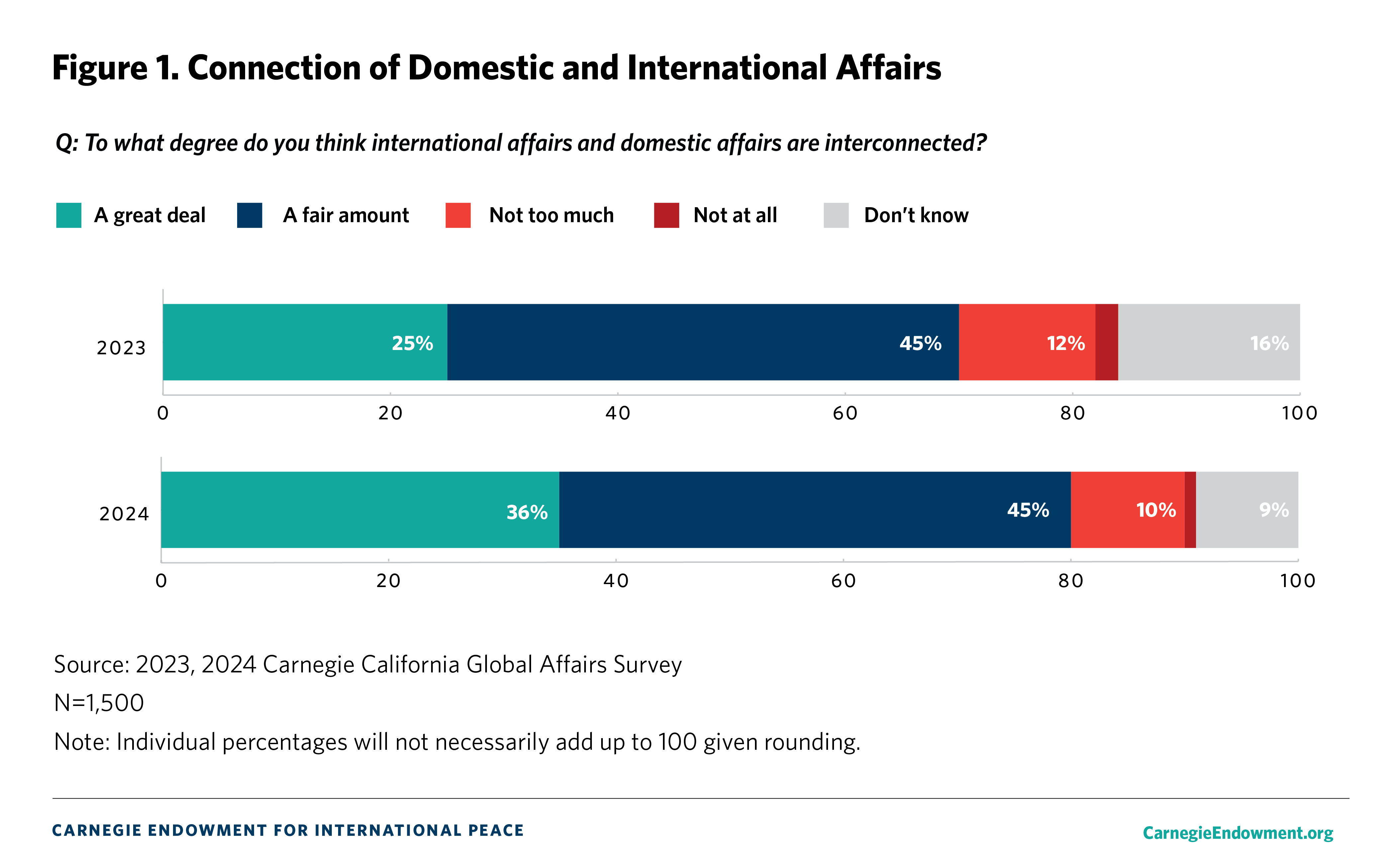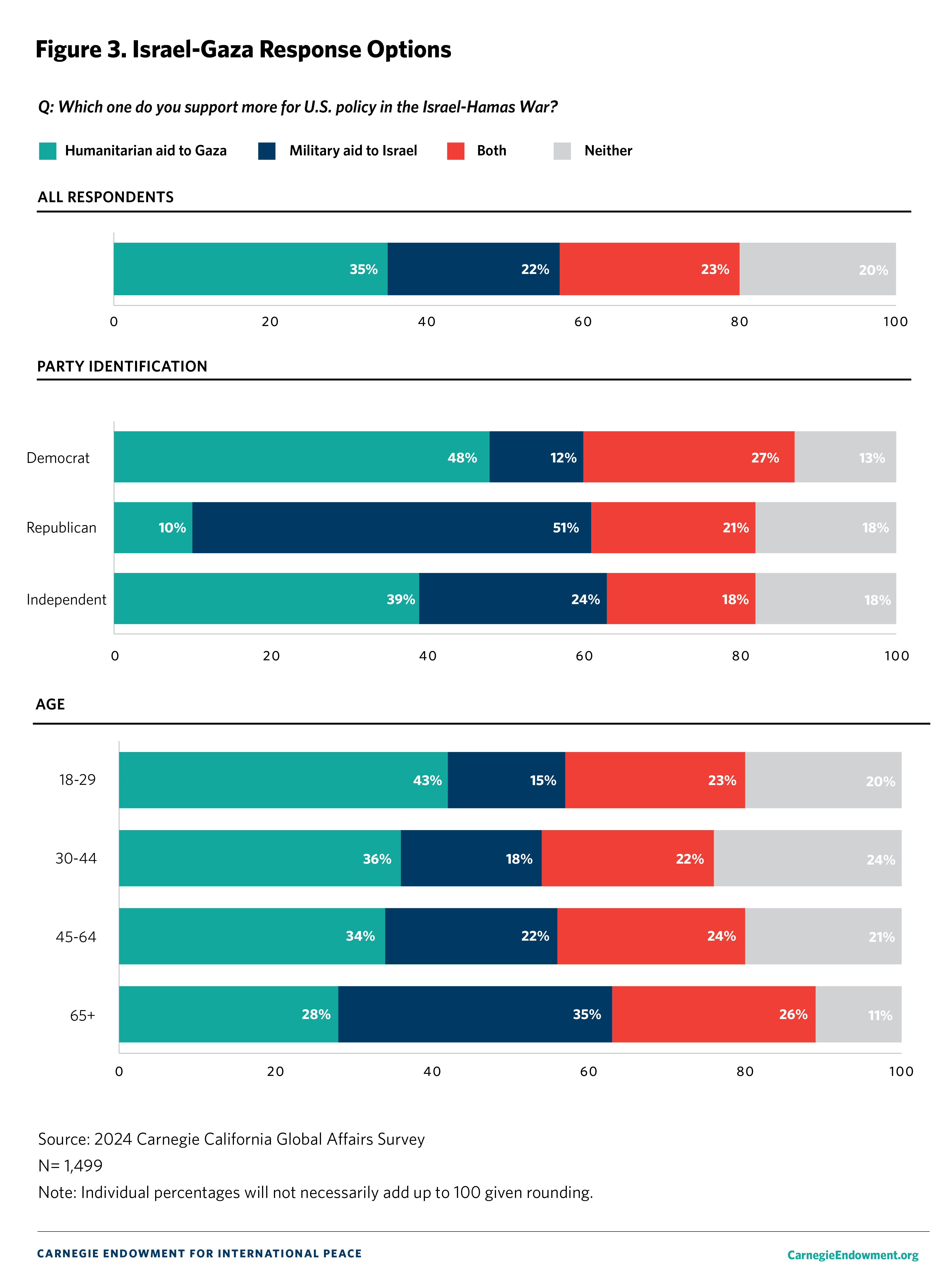 The overall margin of error is +/- 3.5 percent. The margin of error is calculated at the 95 percent confidence interval. We compare current Carnegie California Global Affairs Survey results to the 2023 Carnegie California Global Affairs Survey which was conducted with the same methodology and a number of national and regional surveys.1 The latter include surveys from the Chicago Council on Global Affairs (2023),2 Pew Research Center (2022),3 the Public Policy Institute of California (2001),4 the Carnegie Endowment for International Peace (2022 and 2023),5 and Gallup (2024).6