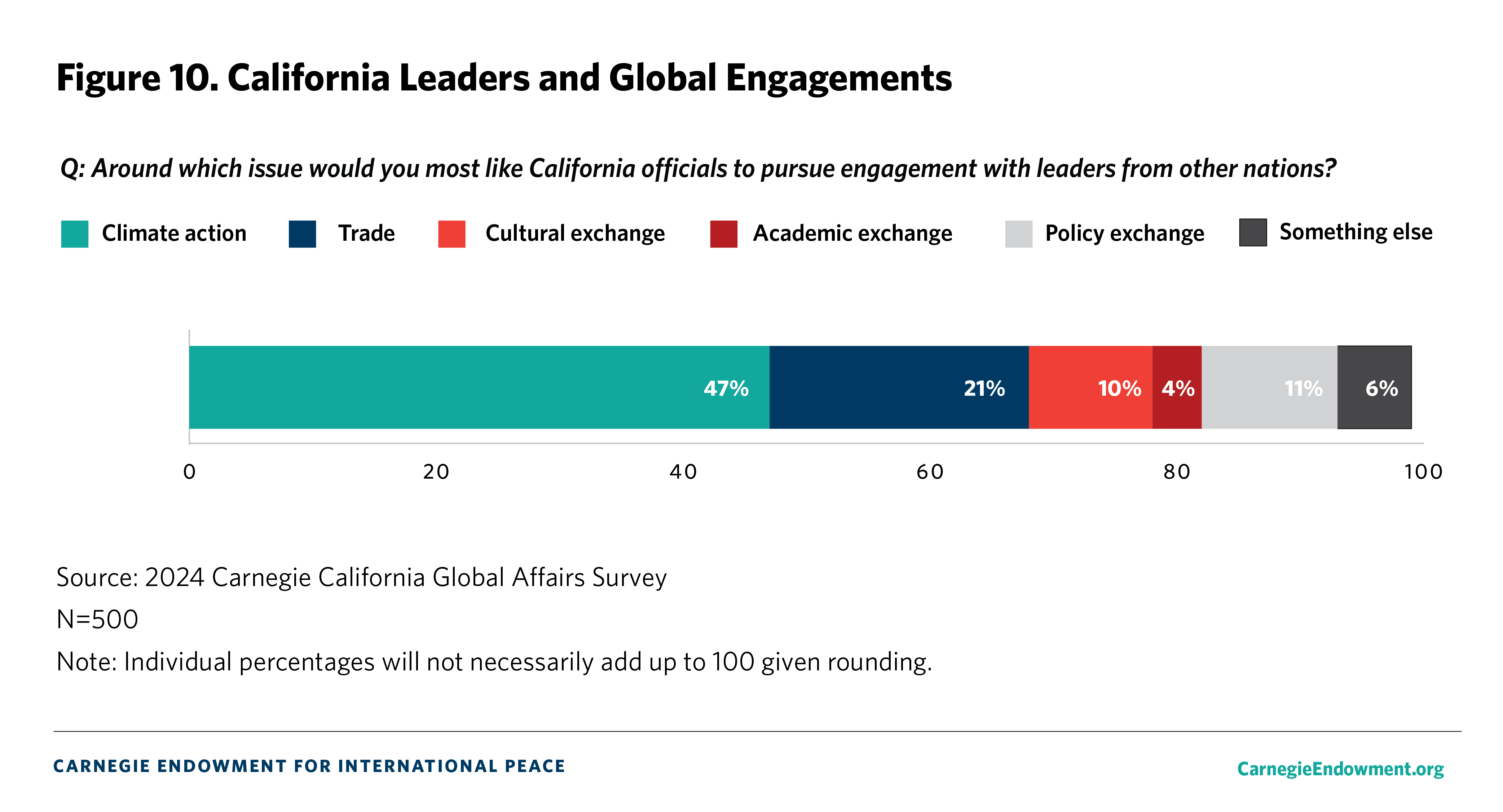 Newsom’s 2023 trip to China aligned with the priorities Californians identify for state-led international engagement. As figure 10 shows, when asked around which issue would you most like such engagement to occur,47 percent identify climate action, 21 percent say trade, and 10 percent say cultural exchange.