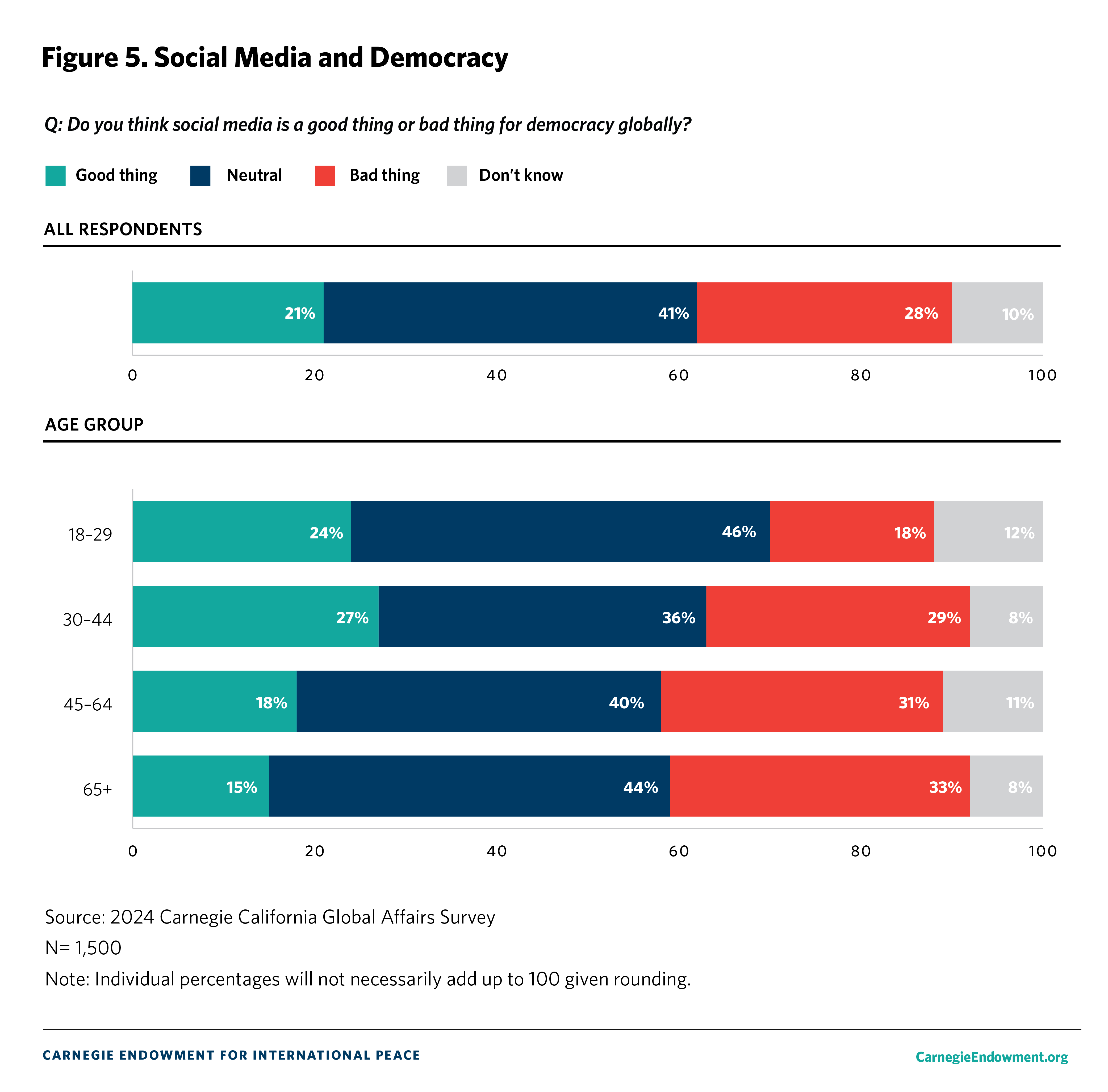 Social media platforms play an important role as information sources in democracies and elections around the world. However, relatively few Californians say that social media has a positive impact on democracy. When it comes to social media’s impact on democracy globally, 21 percent say that social media is a “good thing” and 28 percent say it is a “bad thing.” (Forty-one percent are neutral, and 10 percent say do not know).