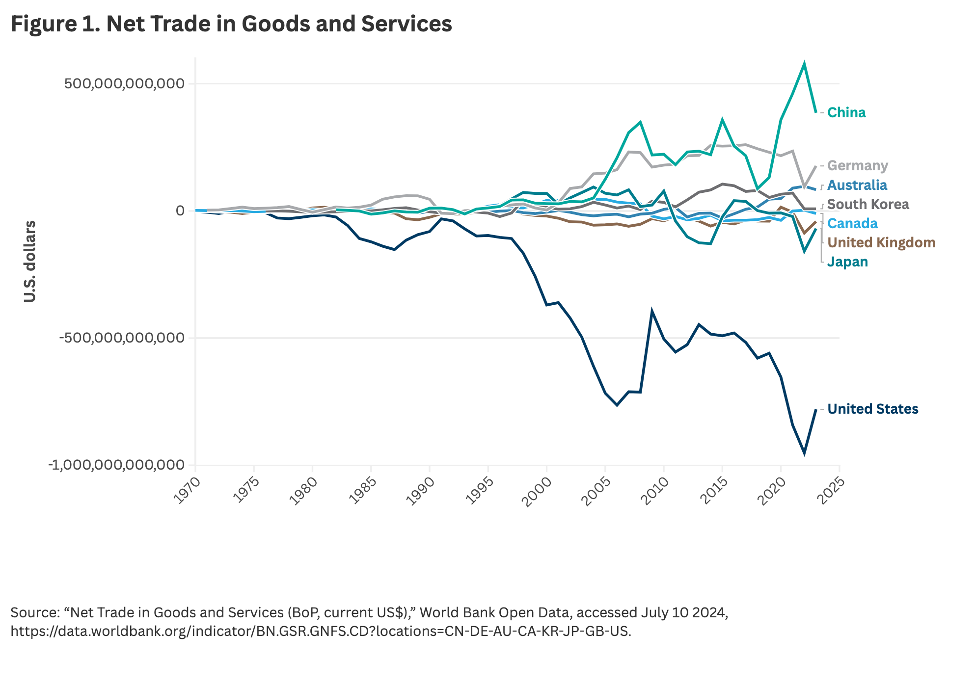 In the current international trading regime, some countries, such as the United States and the United Kingdom, consistently import more than they export, while others, such as China and Germany, consistently export more than they import. Figure 1 shows the trade balance for each of these countries, which measures the value of net exports in goods and services. The United States has persistently been a net importer, while certain other countries have persistently been net exporters.