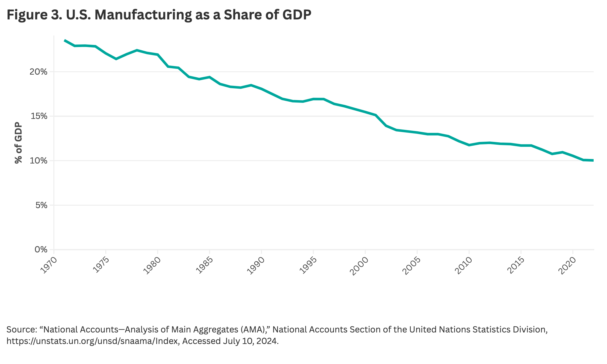 The United States, as a deficit country, experiences the opposite of what surplus countries experience. The current trade system increases the capacity of American households to consume, while reducing the competitiveness of American manufacturing. As a result, U.S. producers are effectively forced to subsidize U.S. consumers, which has hollowed out the American manufacturing industry. The U.S. share of global manufacturing fell from 15 percent to 10 percent over the period 2000 to 2021, as shown in Figure 3. Without the advantages foreign manufacturers enjoy due to their governments’ industrial policies, American manufacturers are forced to compete on unfair terms.