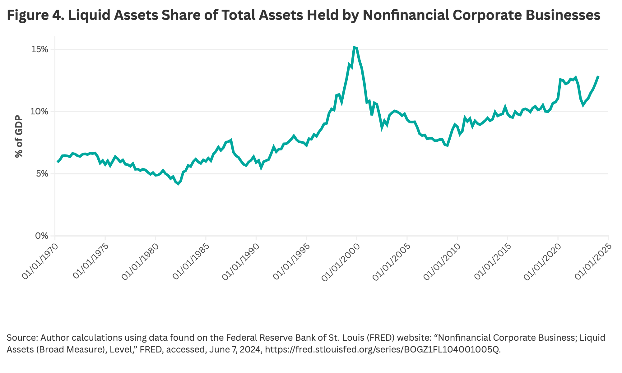 In the United States, business investment is not constrained by the scarcity of capital but primarily by demand. Indeed, American businesses sit on substantial piles of liquid assets, amounting to $6.9 trillion—approximately 12 percent of their assets, even after engaging in substantial acquisitions and share buybacks.21 Since 1970, the liquid asset share of total assets held by American businesses has risen sharply (see Figure 4). In such a context, in which investable capital is abundant, the economy is unable to absorb excess capital as productive investment. As a result, excess capital from abroad crowds out domestic savings. Thus, although the United States should in theory have a high savings rate (because the U.S. has a high level of income inequality and the rich save more of their income than the poor), the United States in fact has a low savings rate at 19 percent compared with 27 percent for the world.22