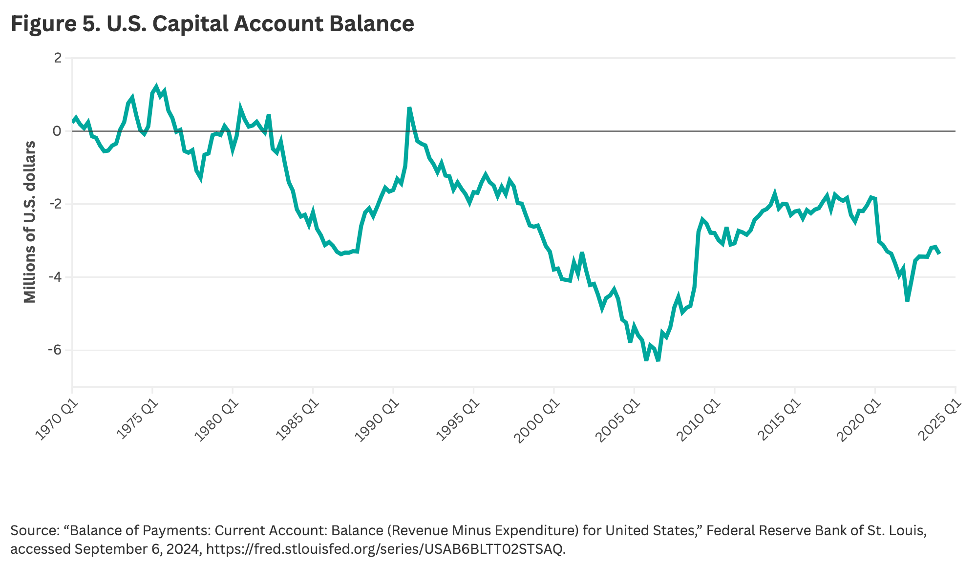 However, the United States has become the world’s top destination for excess global savings, because American assets, such as factories, farmland, apartments, and stocks and bonds, are highly valued abroad due to the United States’ flexible financial markets, robust corporate governance, and friendliness to foreign capital. As a result, much of the world’s trade surpluses have been externalized into the United States in exchange for assets. Because of this, and because the U.S. allows the free flow of capital into its borders, the United States has become a persistent net importer of foreign capital, pushing down its domestic savings rate. As seen in Figure 5, prior to around 1980, the U.S. capital account was roughly balanced, before turning deeply negative amid policy changes that allowed the free flow of capital into the country.