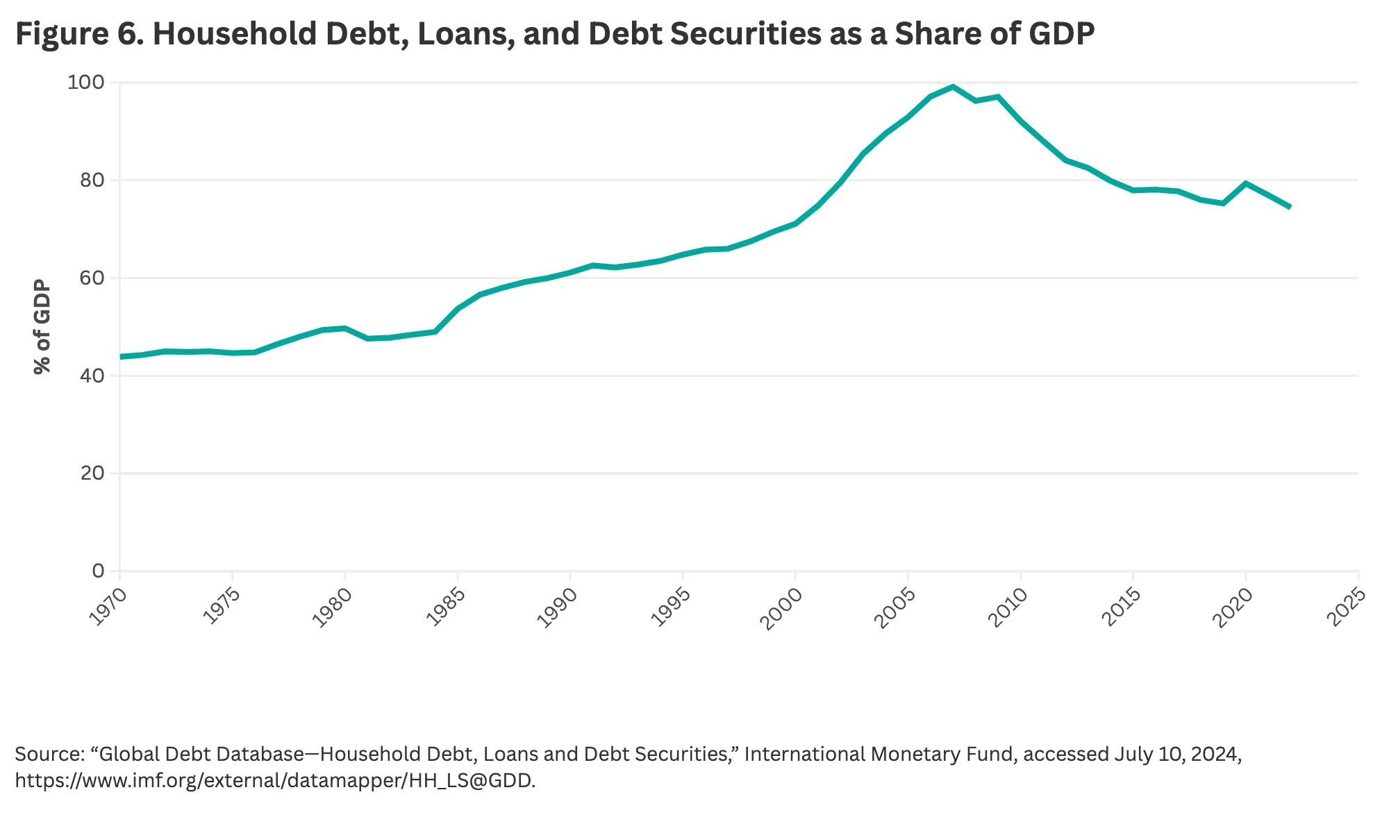 Data on the U.S. economy reflects this rise in government and household debt, as well as the accompanying fall in U.S. savings. The federal deficit has risen precipitously to over $1 trillion in 2023.25 The deficit has grown from 0.26 percent of GDP in 1970 to 6.2 percent in 2023, greater than the GDP share of the United States’ vaunted information sector in 2023.26 Data on U.S. household debt tells a similar story; the debt has risen from 43.9 percent of GDP in 1970 to 74.4 percent of GDP in 2022 (see Figure 6).