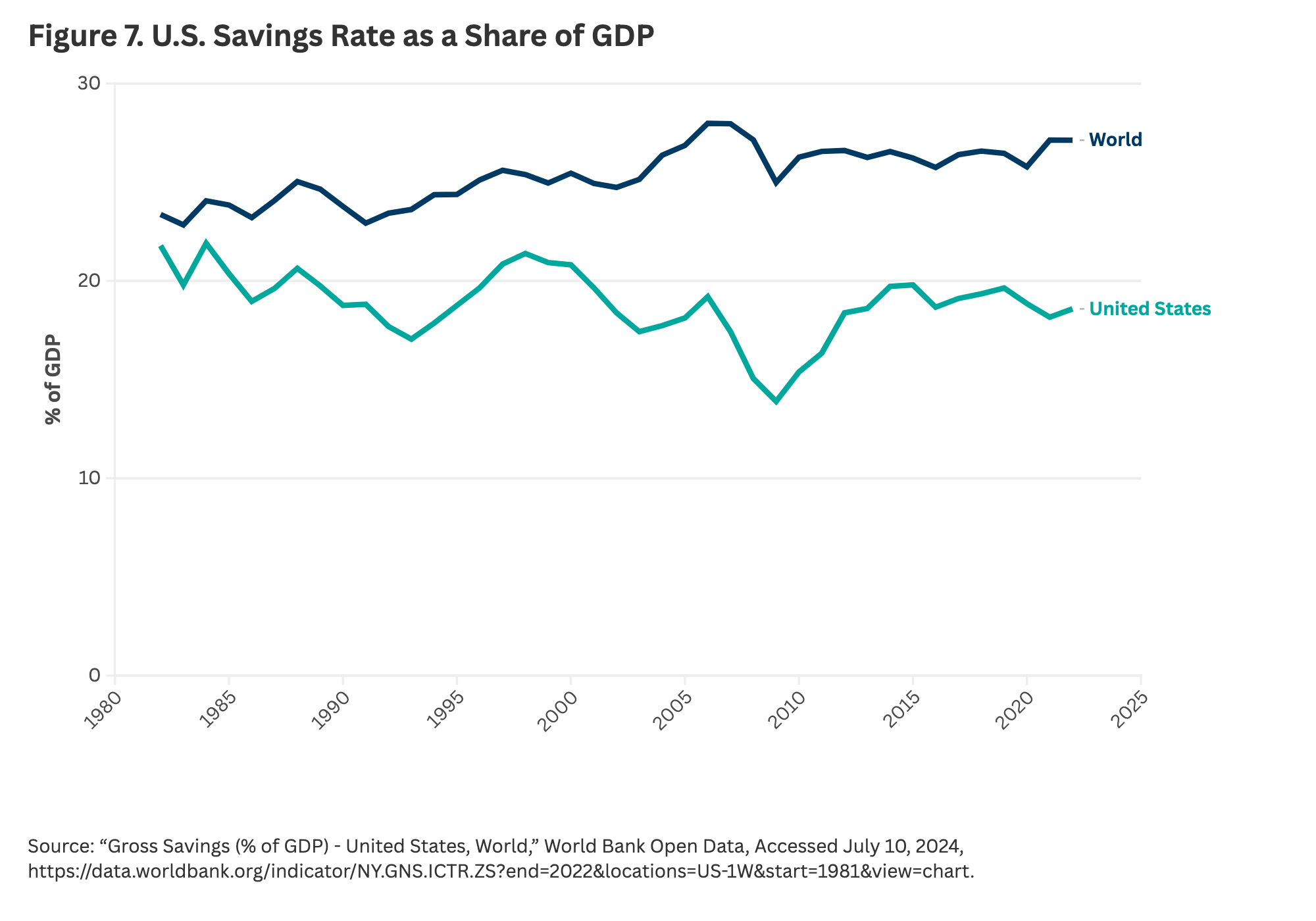 The consequence of this has been a decline in the United States’ savings rate relative to the global savings rate. As seen in Figure 7, forty years ago, the U.S. had a similar savings rate to the world as a whole (22 percent compared to 23 percent). Since then, however, a gap has opened. In 2022, the United States had a savings rate of 19 percent compared to 27 percent for the world.
