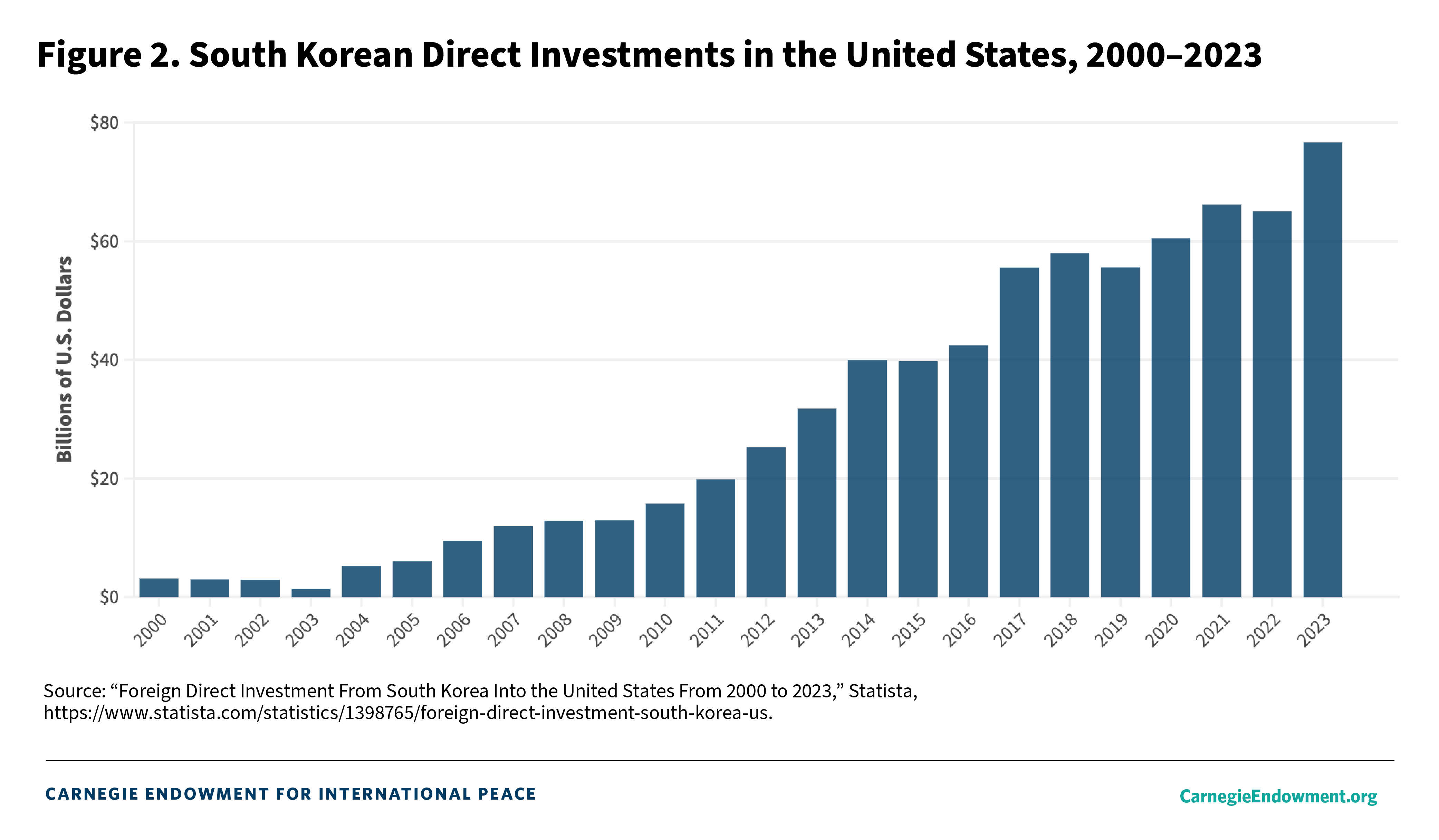 As for the U.S.-ROK alliance’s economic foundation, while South Korean exports to the United States began to take off in the early 1970s and helped propel the ROK into becoming an exporting powerhouse, it wasn’t until the 2010s when South Korean companies began to make serious investments in the United States. As illustrated in figure 1, South Korea’s direct investment in the United States in 2001 was only $3.1 billion, but it rose to $76.7 billion in 2023. (That said, a press release from the South Korean Ministry of Economy and Finance in May 2024 noted that South Korea’s total outbound foreign direct investment (OFDI) was $63.4 billion in 2023, or a difference of more than $13 billion compared to the data provided by Statista.)31