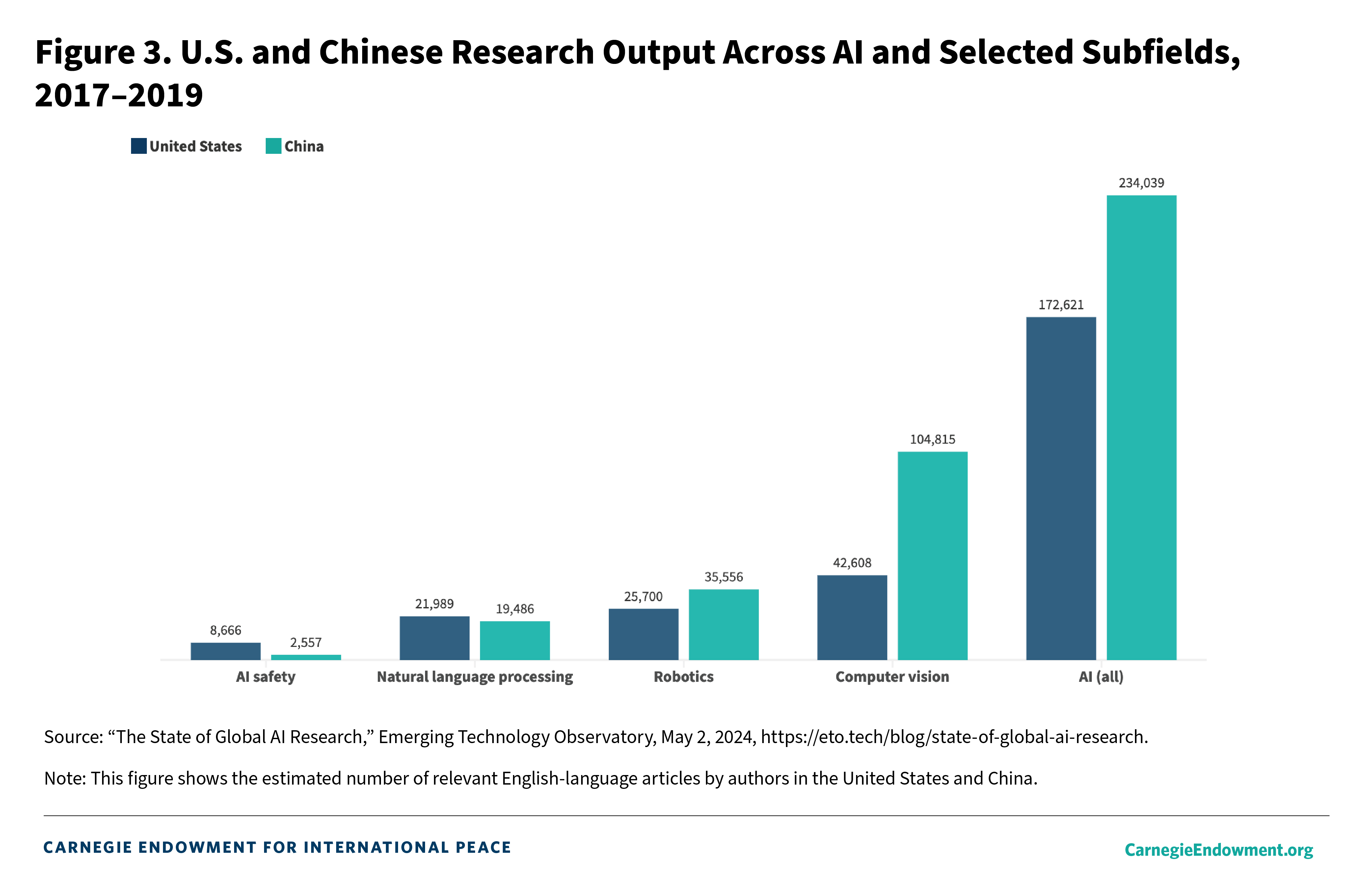 This is not to suggest that the U.S.-China technology competition is over. But other studies such as those conducted by the Center for Security and Emerging Technology at Georgetown University suggest that China leads the United States in “more than half of AI’s hottest fields.”57 According to analysis by the Emerging Technology Observatory in May 2024, among the world’s top 10 AI research institutions, China led with six compared to four for the United States, but all of the top five institutions were Chinese: the Chinese Academy of Sciences, Tsinghua University, Shanghai Jiao Tong University, University of Chinese Academy of Sciences, and Zhejiang University.58 The four U.S. institutions were Carnegie Mellon University (sixth), the Massachusetts Institute of Technology (seventh), Google (ninth), and Stanford University (tenth). U.S. institutions were more competitive in top-cited research, claiming six spots in the top ten, whereas China had four. While China’s sheer magnitude of AI research is impressive, the United States still retains the edge in terms of highly cited articles.59