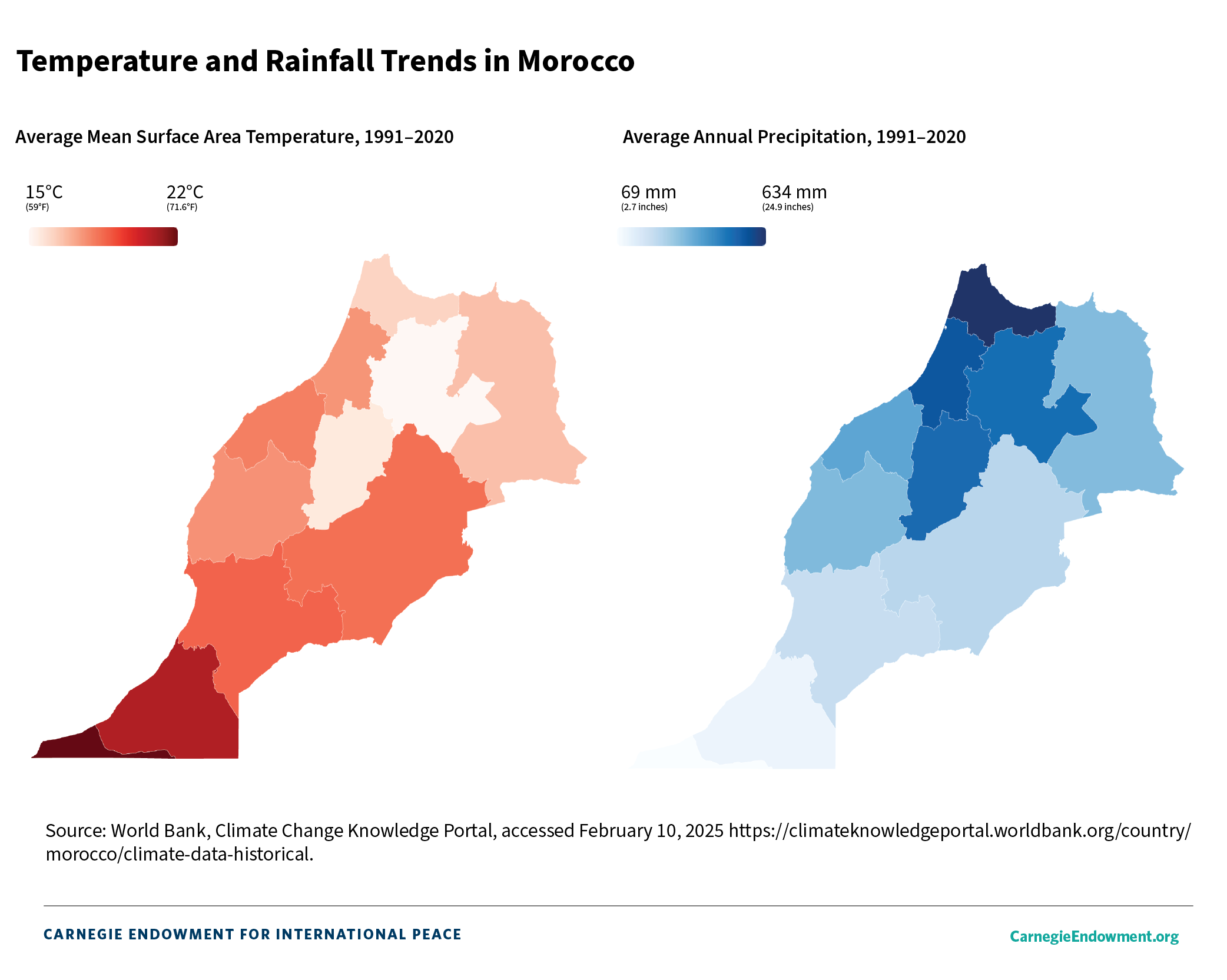While ultimately rooted in the country’s severe aridity and shortage of replenishable water sources, Morocco’s climate change vulnerabilities have been worsened by long-standing governance deficiencies, especially unsustainable agricultural policies centered on profitable, water-intensive crops that have historically benefited regime-connected landowners with narrow interests while excluding more vulnerable populations. Climate-friendly energy projects have often failed to reach their full potential because of mismanagement and poor interagency coordination, and some of Morocco’s stated plans to mitigate climate problems run the risk of augmenting rather than ameliorating these vulnerabilities. For example, to diversify its energy sources, Morocco will use water to further its green hydrogen plans, but doing so will seriously strain an already scarce resource.5 Additionally, climate-related stresses in Morocco are exacerbated by the long shadow of French colonialism in the water management and agricultural sectors, which bequeathed to the country what one Moroccan scholar called an “irrigation myth” of cultivating water-intense crops in an arid environment that has left its smallholder farmers and other rural inhabitants acutely exposed to global warming.6 And the government’s ability to protect communities in remote areas from climate stresses has been hobbled by the obstacles confronting local civil society actors, which prevent them from representing vulnerable citizens and effectively mobilizing on climate adaptation.