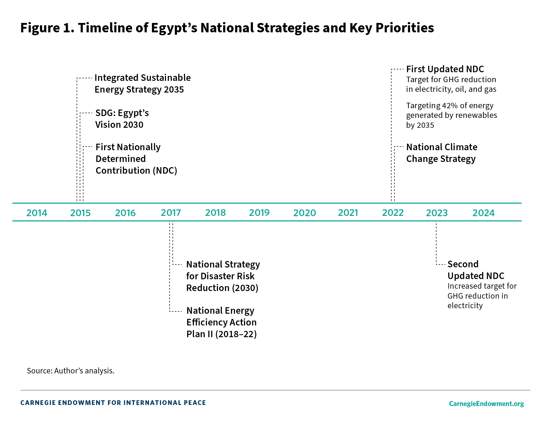 In recent years, Egypt has expanded its climate strategy to be responsive to the country’s unique challenges resulting from increased vulnerabilities and opportunities in the green economy. The government has harmonized its country-level Sustainable Development Goals (SDGs) and Nationally Determined Contributions (NDCs) with a clear target to expand public and private investment in the renewable energy sector and increase its share in Egypt’s energy wallet. However, clear metrics to reach other climate targets—such as an overarching reduction of greenhouse gases (GHGs) by 2035, a green transition in industries, construction, tourism, and waste (a significant methane producer), and improvements in water preservation standards—have been lagging. Furthermore, the agricultural, land, and waste sectors have not been included in mitigation efforts. Finally, many of Egypt’s NDC targets are conditional upon receiving international support, and the fluctuation of this support has been an ongoing challenge in the global climate space.