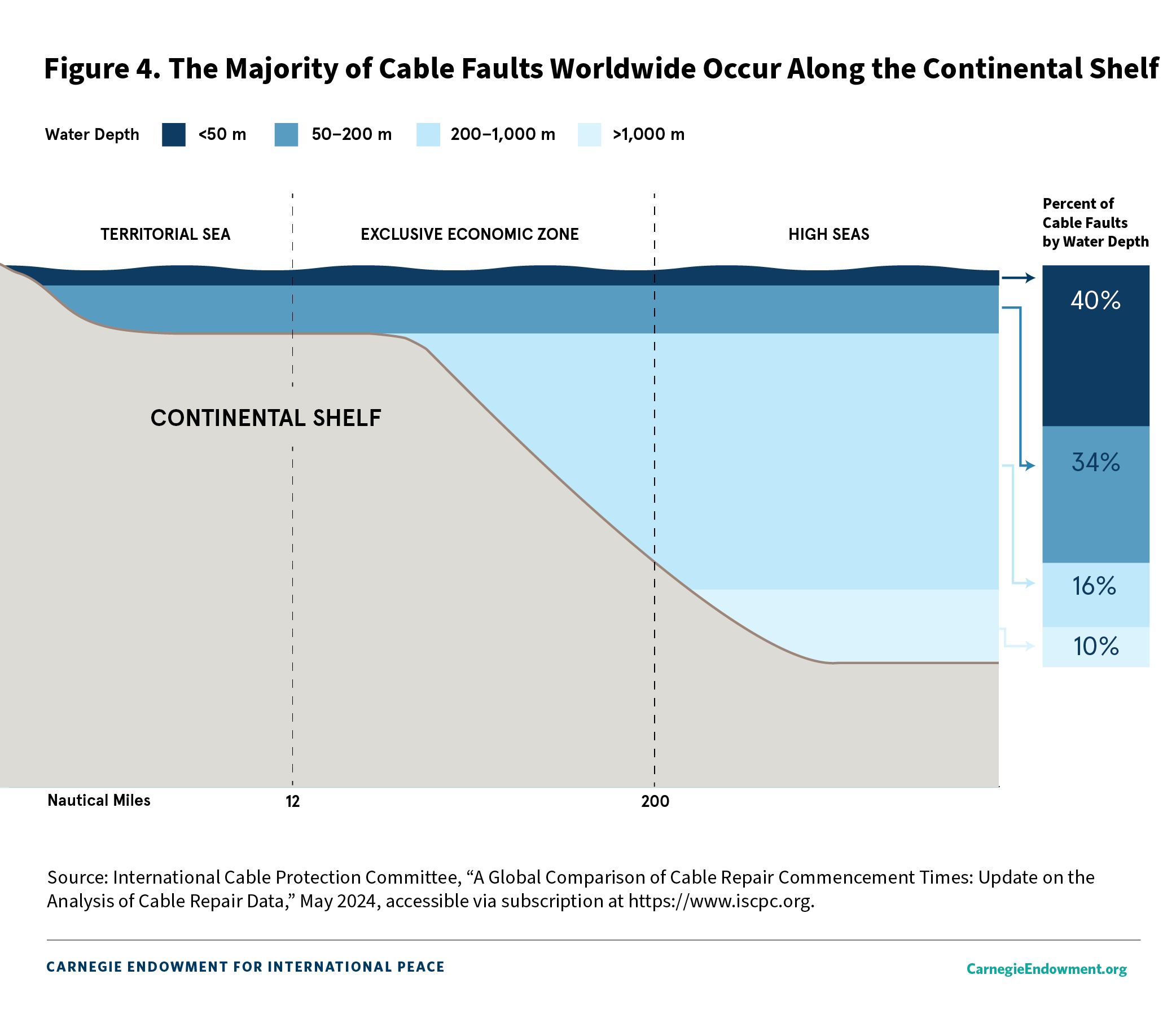 An additional challenge is the fact that undersea cables traverse multiple geographic and maritime zones, extending from terrestrial areas to the high seas. This means that cables span multiple national and international governance jurisdictions, which can create regulatory complexity and uncertainty. Although undersea cables are primarily a private sector investment, there are shared interests in their security, meaning their repair and efficacy requires a multistakeholder approach. Many different authorities are involved in subsea cables, including national authorities for telecommunications, security, and maritime areas. When a cable cut occurs, jurisdiction matters for many reasons, including for accessing undersea cables and for dealing with recourse. A key legal tenant for submarine cables is the United Nations Convention on the Law of the Sea (UNCLOS), which demarcates the ocean’s boundaries and provides a legal framework for laying and repairing submarine cables (see figure 4).37