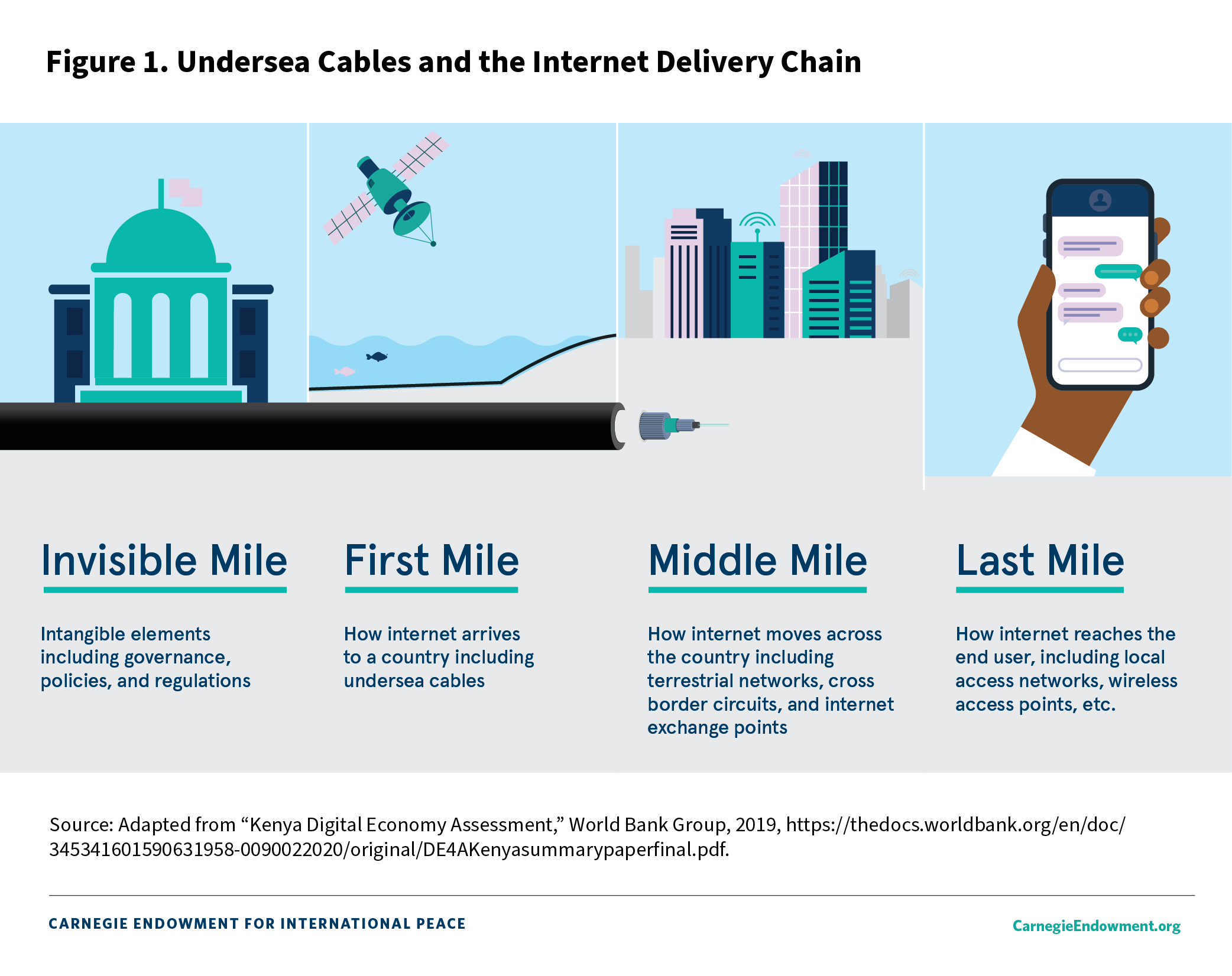 Undersea cables constitute a critical component of the internet delivery chain, serving as an integral part of the first mile infrastructure that facilitates internet access to a country (see figure 1). They connect and transmit data to the middle mile—terrestrial networks, such as national backbones. These subsequently link to the last mile, facilitating connections to the end user via mobile or fixed broadband services. The significance of undersea cables to Africa, therefore, cannot be underestimated and necessitates strong governance (considered part of the invisible mile) and management to guarantee that Africa’s internet ecosystem flourishes and delivers the anticipated digital benefits.11