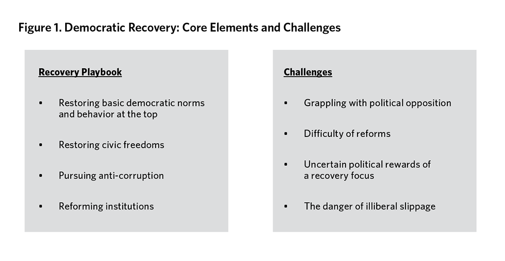In a global political landscape marked by twenty years of widespread democratic backsliding, some good news exists: in a handful of countries where leaders significantly undercut democratic norms and institutions, elections have brought to power new leadership with a strong declared commitment to restoring democracy. Although these cases are relatively scarce and the processes of attempted re-democratization still new, they nevertheless provide valuable provisional lessons about an emergent democratic recovery playbook.