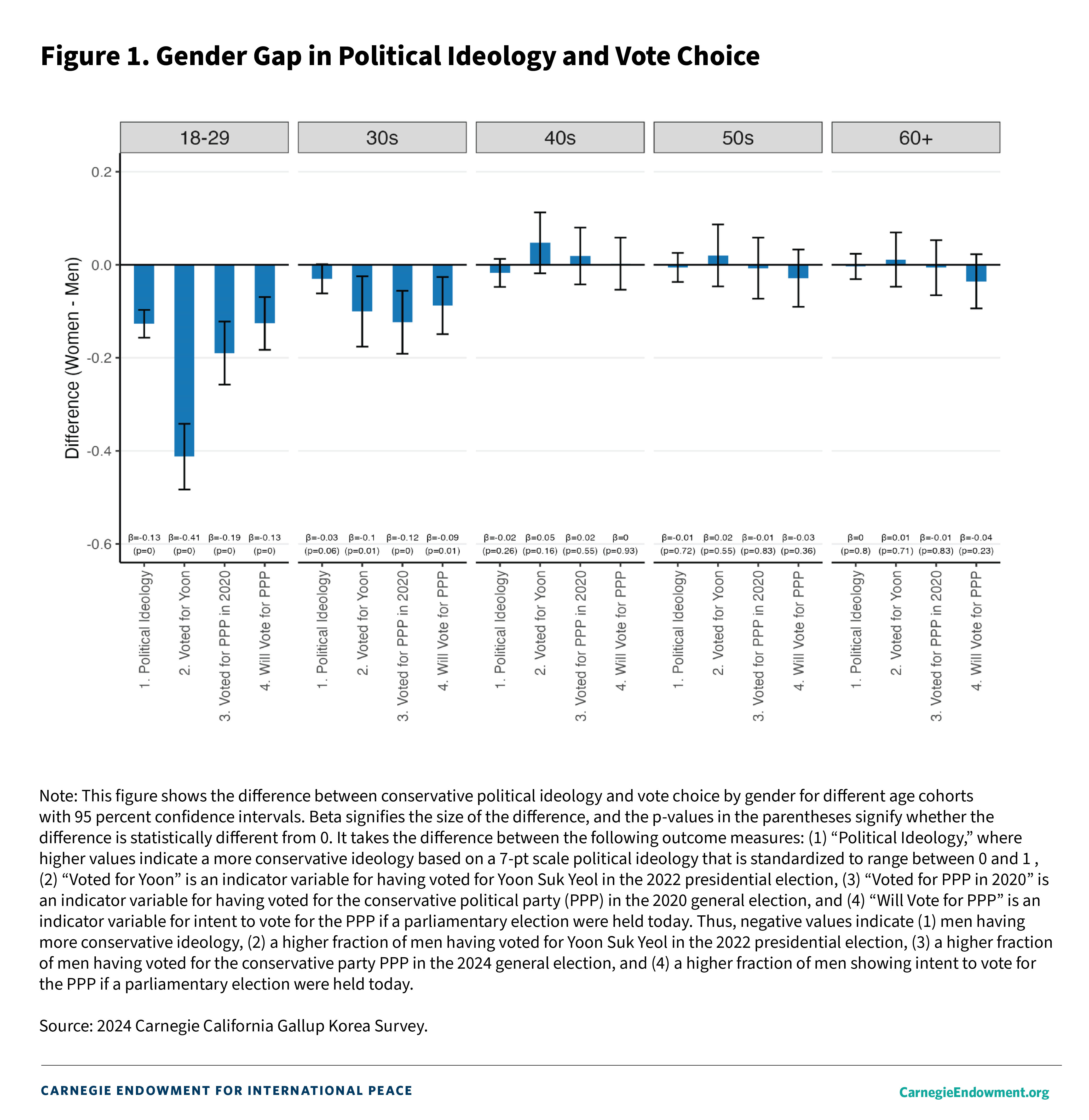 The 2024 Carnegie California Gallup Korea Survey1 and the 2024 Carnegie California Embrain Korea Survey,2 administered with Gallup and Embrain, respectively, offer a new and detailed examination of how South Koreans think about issues regarding gender.3 The surveys confirm that an alarming gender and generational divide with regards to gender attitudes exists in South Korea, and this divide reflects broader ideological shifts, underscoring the pressing need for evidence-based targeted interventions, policy solutions, and expanded efforts to counter this trend.