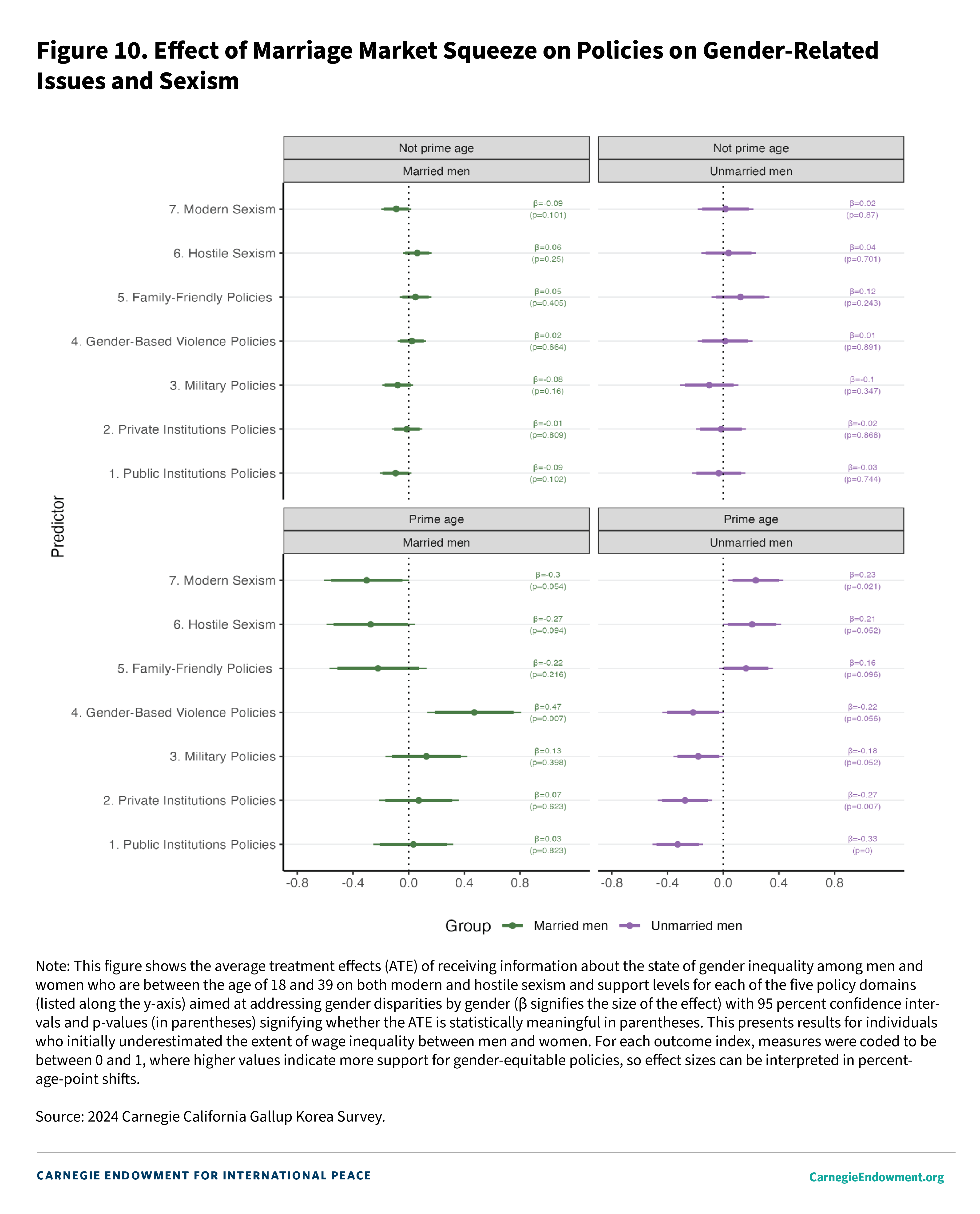 It is striking how widespread this backlash is. It is not confined to just one issue—it cuts across almost every domain we examined (see the negative average treatment effect [ATE] estimates for outcomes “1. Public Institutions Policies” through “4. Gender-Based Violence Policies,” that is, declines in support for these policies) in the bottom right panel (unmarried men in their prime marital age) of Figure 10). Unmarried men in their prime marital years are more resistant to having more women in government and political leadership. They push back against greater female representation in private industry. They prefer hiring and promotion policies that give preference to those with a military service background—policies that, by design, favor men since all men in South Korea are required to serve, while women are not. And they are even less supportive of measures designed to prevent gender-based violence, both online and offline. The pattern is clear: resistance to women’s empowerment stemming from feeling squeezed in the marriage market is not isolated—it is systemic.