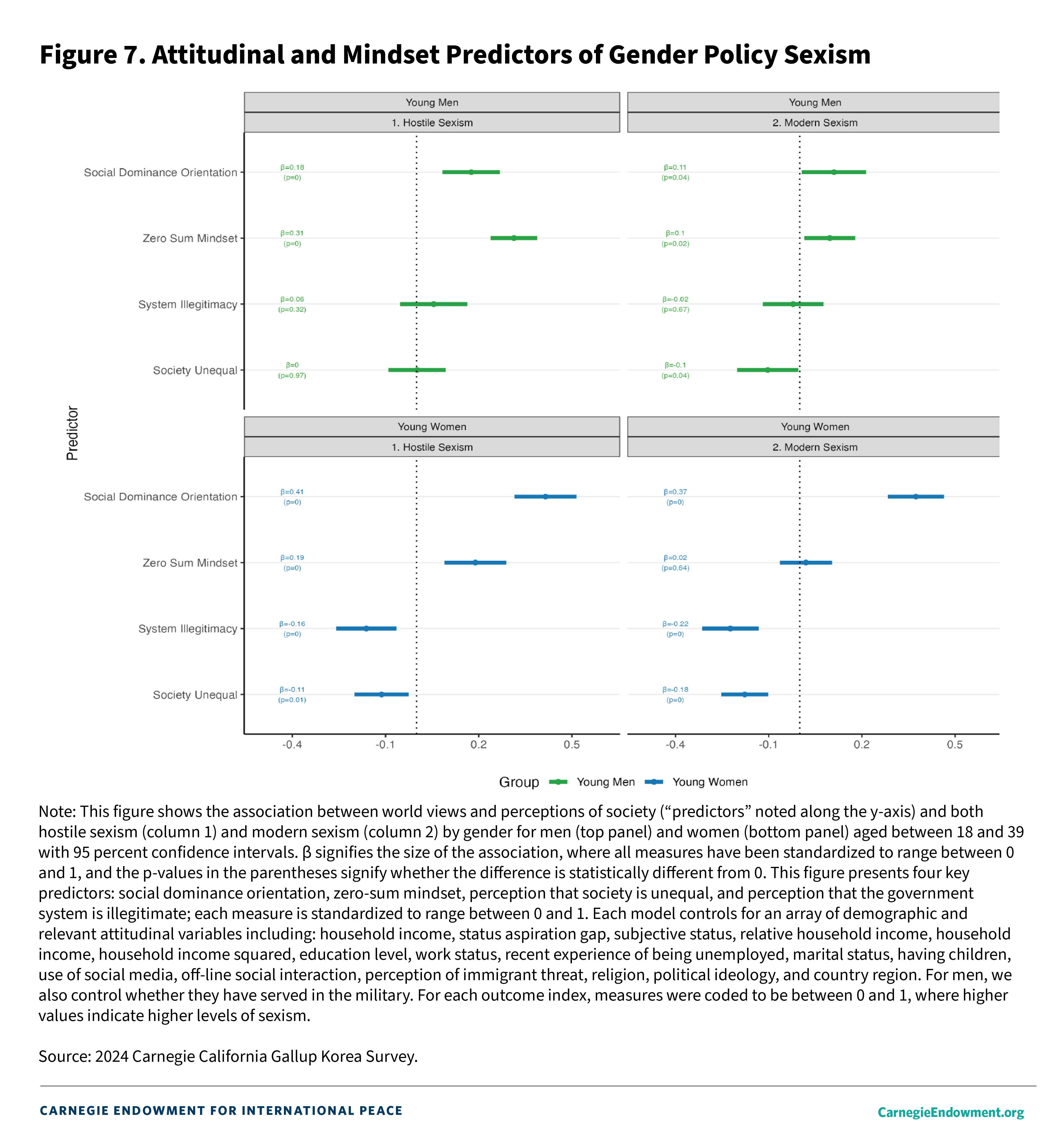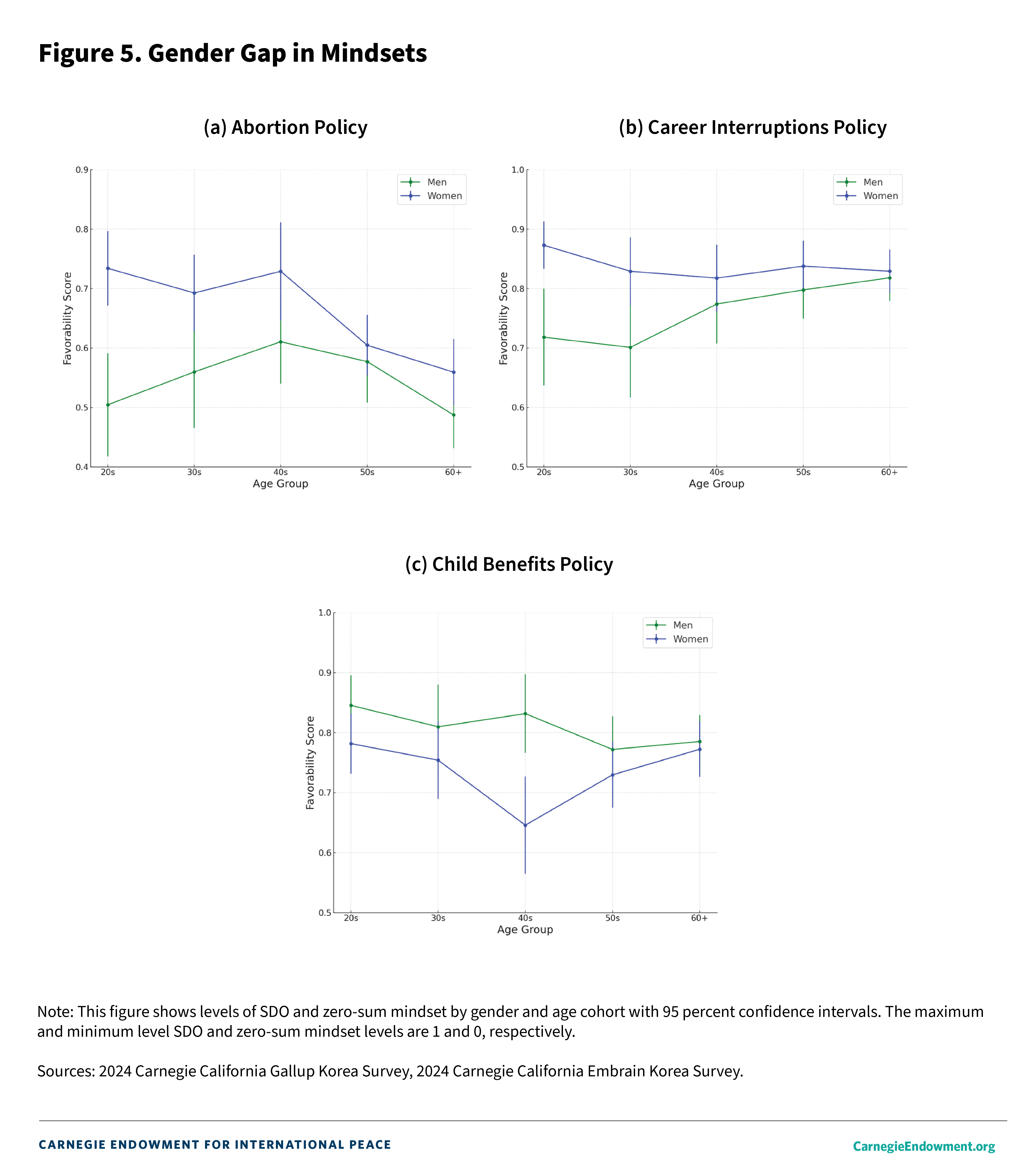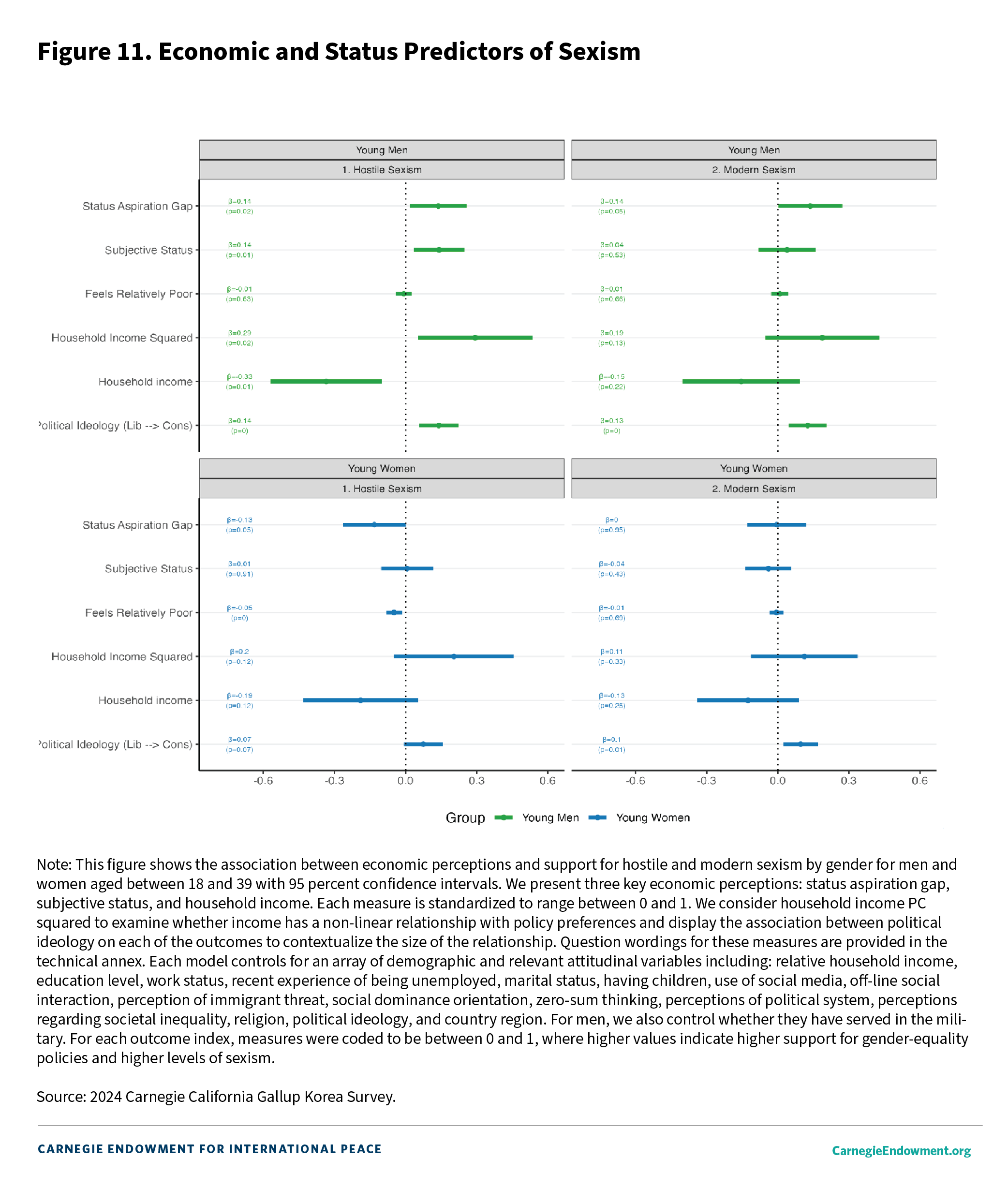 Finally, findings from the 2024 Carnegie California Embrain Korea Survey show that economic and status anxiety play a crucial role in shaping attitudes toward gender equality, but not always in expected ways. Improving a young man’s status or removing his financial struggles does not necessarily translate to greater support for gender-equality policies. Improvements in his economic position could translate to gender backlash if his perceived status fails to keep pace with his aspirations. The status aspiration gap—the distance between where young men see themselves and where they believe they should be—emerges as a powerful predictor of resistance to gender-equality initiatives. Those with a wider gap are significantly less supportive of gender-equity policies and show substantially higher levels of both hostile and modern sexism. Relative economic standing also plays a role, with young men (women) who see themselves as relatively poorer being less (more) likely to back gender-equality efforts than those who do not. This finding aligns with the work of Kosec, Mo, You, and Boittin, who found that regressive gender norms may take hold in places where the population feels relatively deprived, even if they are not absolutely deprived. Ultimately, these findings suggest that beyond one’s actual economic circumstances, the perception of falling behind others and the sense of being distant from one’s aspirations can drive resistance to gender equality.