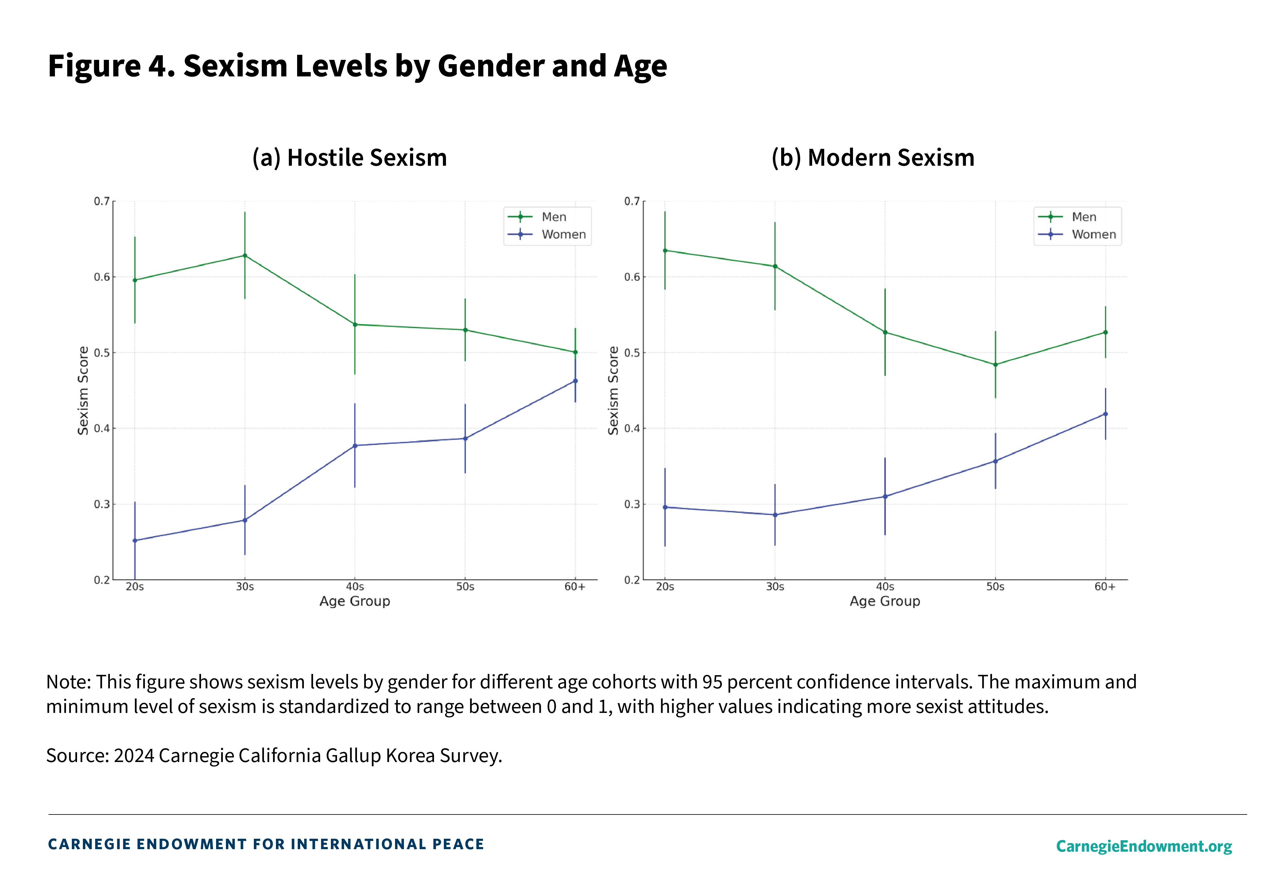 Building on You’s study, findings from the 2024 Carnegie California Gallup Korea Survey confirm that men’s resistance to women’s empowerment intensifies when they are made aware of the gendered marriage gap. Unmarried men, in particular, show lower support for policies to advance women’s empowerment. Beyond policy resistance, unmarried men also express greater hostility toward women, endorsing both overt and subtle forms of sexism. These findings highlight how shifting marriage dynamics shape attitudes toward gender equality and can fuel resistance to policies designed to address systemic disparities.
