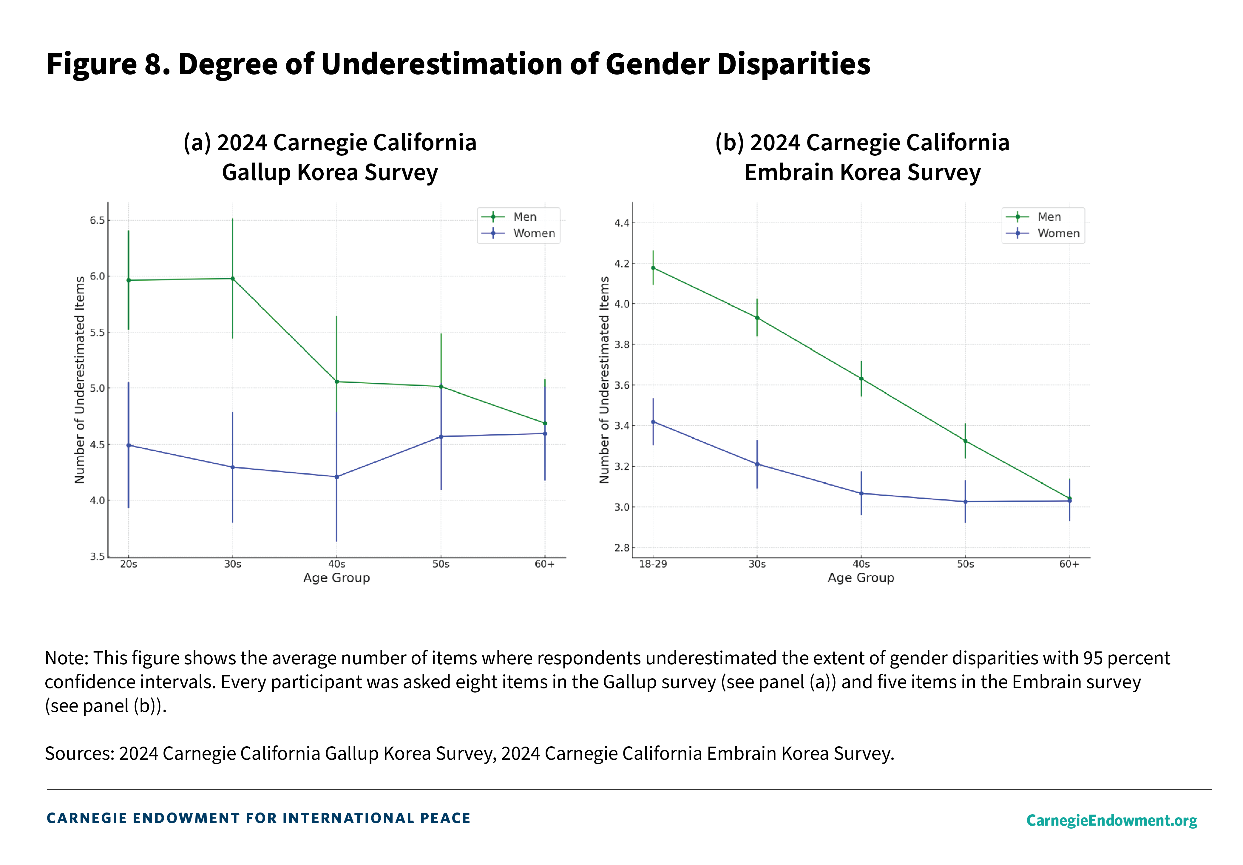 These patterns, with the largest gender disparity being among those in their 20s and 30s, were largely replicated in the 2024 Carnegie California Embrain Korea Survey (see Figure 8[b]). Unlike what we observed in the Gallup sample, in the Embrain sample, a slight negative relationship between age and awareness is observed among women as well. However, this inverse relationship is much more pronounced among men. As observed in the Gallup sample, the gender gap clearly diminishes as age cohorts progress. These findings suggest that younger men are particularly prone to downplaying gender disparities, distinguishing them from both their female peers and older male counterparts.
