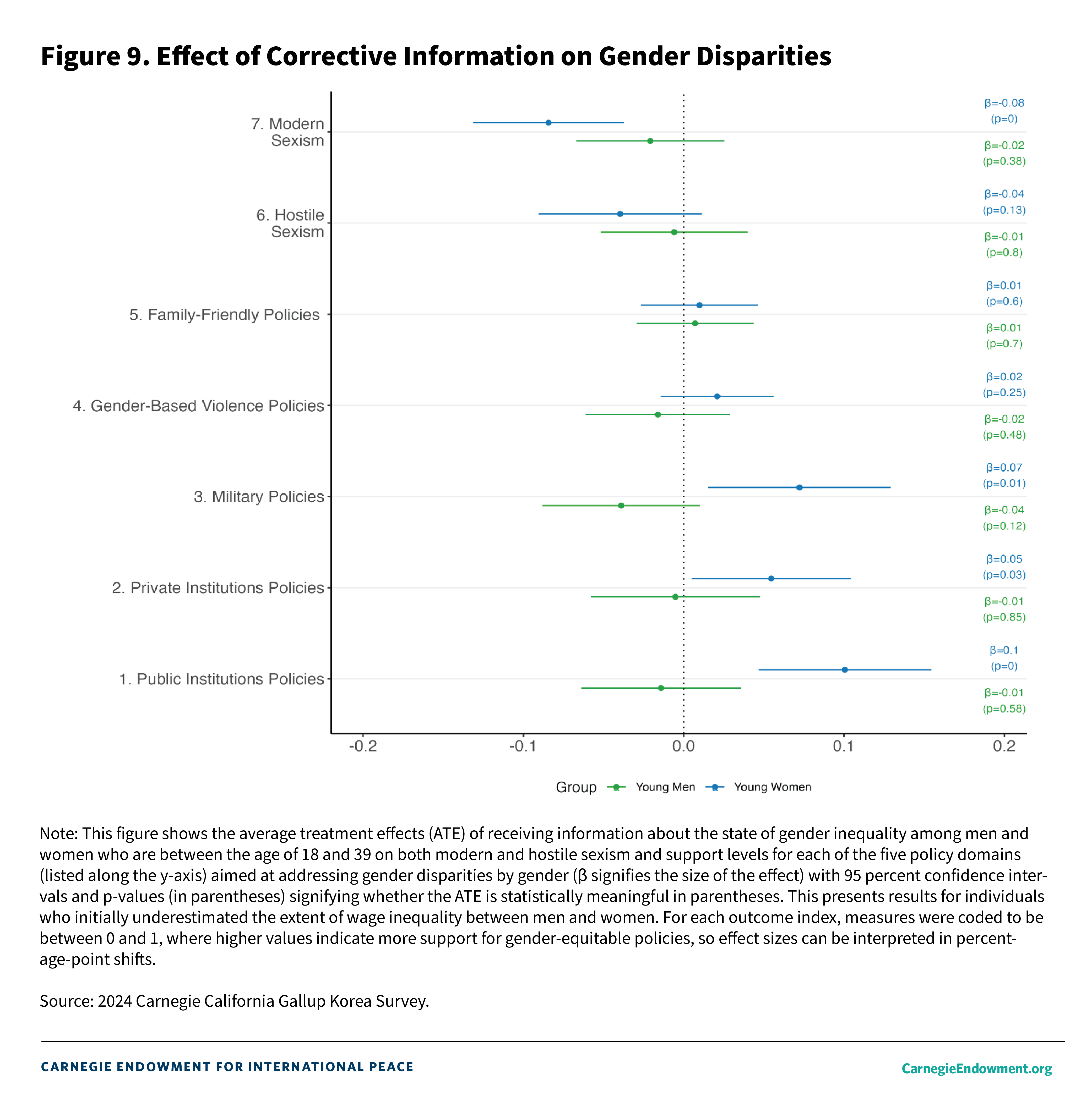 When provided with corrective information about the actual extent of gender disparities, young women who initially underestimated these inequalities consistently show decreased modern sexism, which is a metric that, in part, gauges the extent to which individuals deny the existence of discrimination against women, as well as increased support for policies and programs promoting gender equality in the public and private sector, and for policies related to military service that do not favor men (see the estimates for “1. Public Institutions Policies” through “3. Military Policies” and “7. Modern Sexism” in Figure 9).12 Effect sizes range from 5 to 10 percentage points. However, the same information has no measurable positive impact on the policy preferences of young men. In other words, efforts to highlight realities regarding gender gaps in the economic, political, and social spheres worsen the divide. These results suggest that intensive efforts to shine a light on gender inequality in South Korea will likely not help bridge the divide.