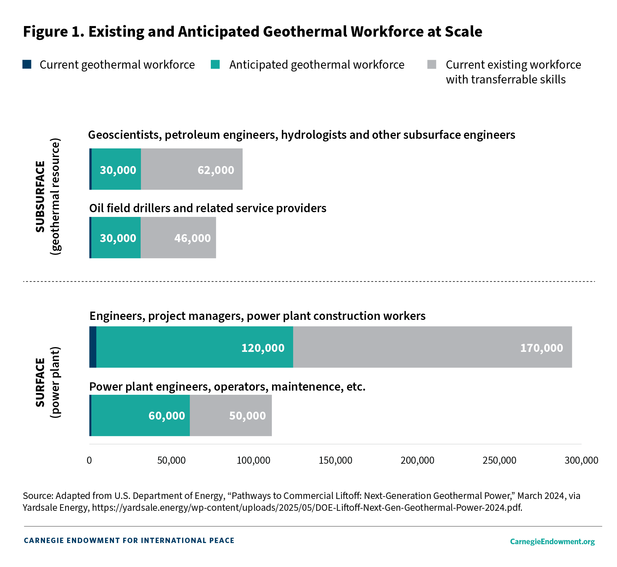 With increasing international competition across clean energy industries, the United States should look to capitalize in industries and technologies where it has an early lead and natural and competitive advantages. The country has massive geothermal resources and a history of leadership in drilling innovations, largely led by the expertise and technology seconded from the oil and gas industry. And while the geothermal workforce today is small, its potential is enviable due to the transferability of skills from conventional energy and power-producing industries. More than 300,000 workers in the U.S. oil and gas industry have skills that are directly transferable to the SHR geothermal industry (see figure 1). That workforce gives the United States an edge in scaling its geothermal industry and suggests that a fast transition would be smoother than for other countries.