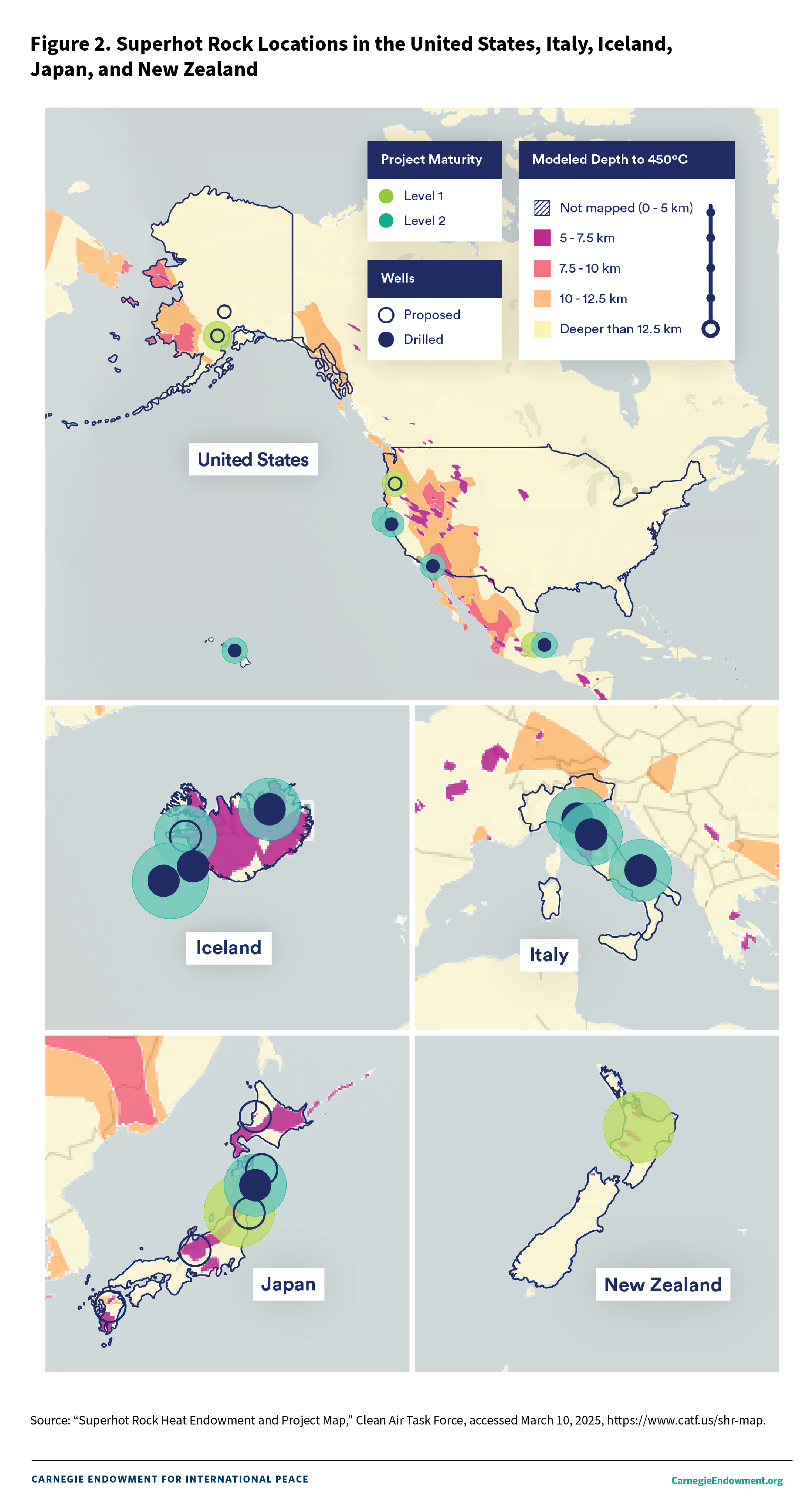 By working closely with allies that are exploring SHR development, the United States can minimize risk and give its industry access to best practices and developments across a range of geologies. The critical partners for the alliance include Iceland, Italy, Japan, and New Zealand, all of whom are exploring superhot geothermal resources and face a range of challenges to commercialize the technology (see figure 2). The United States has already executed memoranda of cooperation or agreements to collaborate on geothermal with Japan, Iceland, and New Zealand, the latter of which was reached during Donald Trump’s first administration, and maintains a close relationship with Italy. Iceland has also issued joint statements with both Japan and Italy on geothermal collaboration. Formalizing collaboration as a consortium would strengthen research and development capacities for each country. The newly launched SHR task group under the International Energy Agency (IEA) Geothermal Technology Collaboration Program—now led by representatives of Norway, Japan, New Zealand, Iceland, and Italy—is a fantastic step and opportunity for deeper collaboration, and one in which the United States should seek a leadership role.