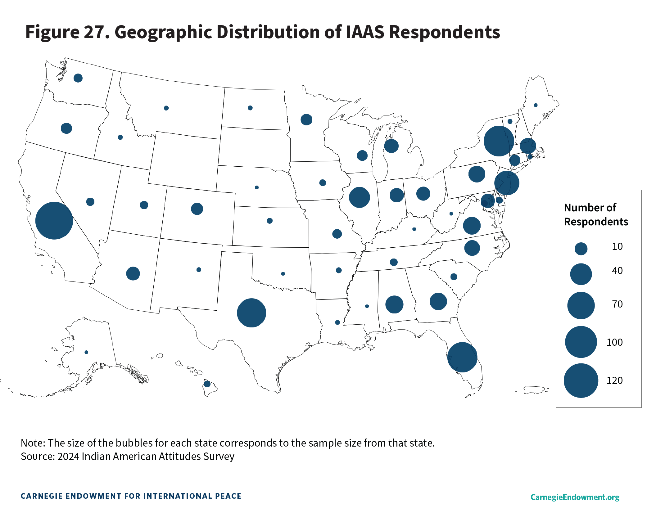 To that end, this study aims to shed light on ordinary Indian Americans and their lived social realities. Its findings are based on a nationally representative online survey of 1,206 Indian American residents in the United States—the 2024 Indian American Attitudes Survey (IAAS)—conducted by the Carnegie Endowment for International Peace between September 18 and October 15, 2024, in partnership with YouGov. The survey, drawing on both citizens and noncitizens in the United States, was conducted online using YouGov’s proprietary panel of U.S.-based participants and has a maximum margin of error of +/- 3 percent.
