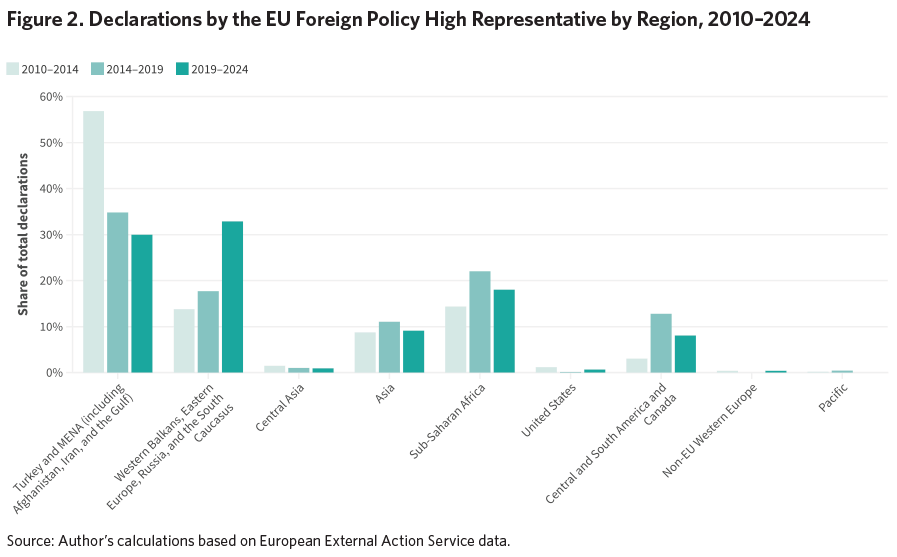 This study analyzed the high representative’s statements from 2019 to 2024 by tracking references to specific countries and general topics. Not all declarations are the same: Some define the EU’s initial reaction to an unexpected development or crisis, while others simply rehash the union’s position on a foreign policy topic. Declarations also reflect the interests and priorities of the HR/VP, while summit conclusions are more institutional and are issued only after careful negotiation.