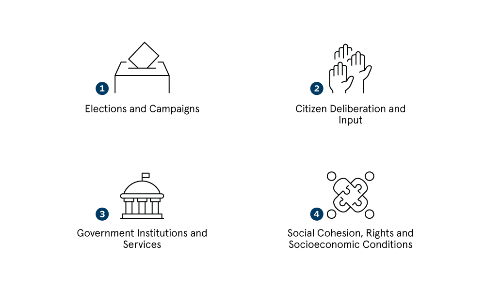 For AI to, on balance, benefit and not weaken democracy, more work is needed to identify the most promising interventions. The four intersection points mapped in this paper present a diversity of spaces where efforts can shape democracy—from elections to wider domains around citizen deliberation, governance, and social harmony—factors that are in turn shaped by the broader environment of peace, geopolitics, and security.