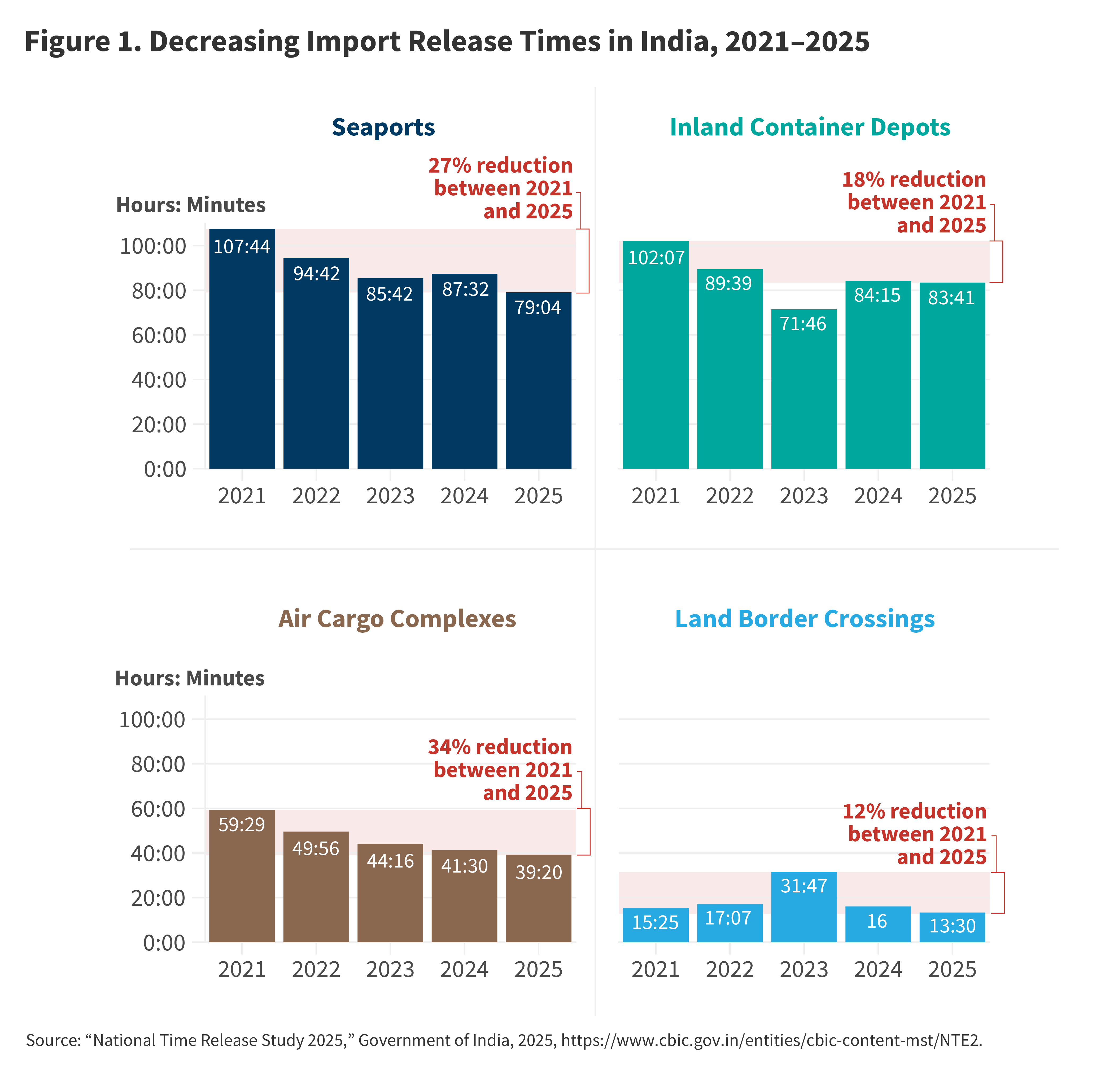 Ultimately, TRSs allow governments to track performance and continuously improve border processes. The World Trade Organization’s Trade Facilitation Agreement encourages use of TRSs for exactly this reason—what gets measured gets managed and eventually gets improved. India’s experience confirms the power of measurement: Between 2021 and 2025, import release times were reduced by 27 percent at seaports, 18 percent at dry ports, and 34 percent at air cargo complexes.