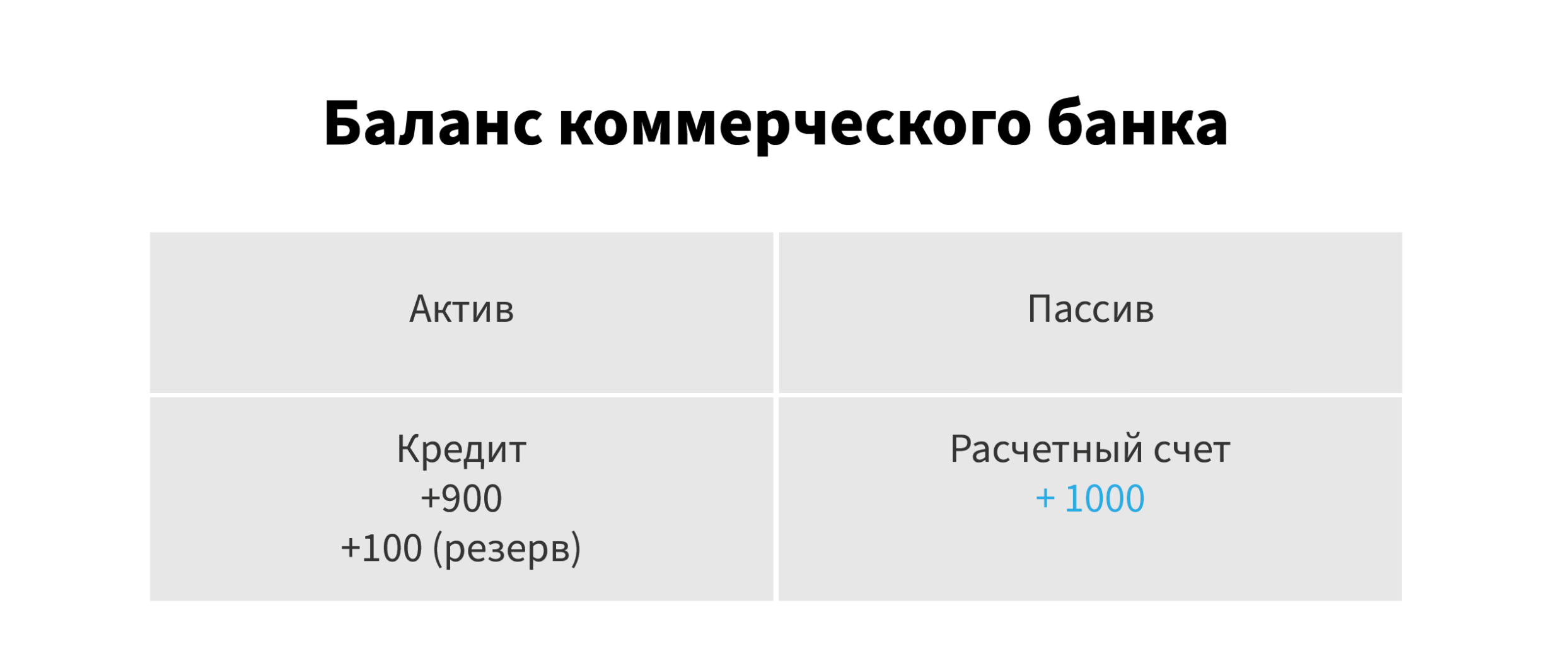 Но что происходит при выдаче кредита в 900 рублей? Пассивы банка не меняются: он по-прежнему должен Александру 1000 рублей. Его активы тоже не изменились в объеме, но изменился их состав: теперь там 100 рублей резервов и 900 рублей кредита Ивану. То есть в экономике, помимо Александра с покупательной способностью в 1000 рублей, появился Иван с 900 рублями. Экономика приросла деньгами, созданными кредитом.