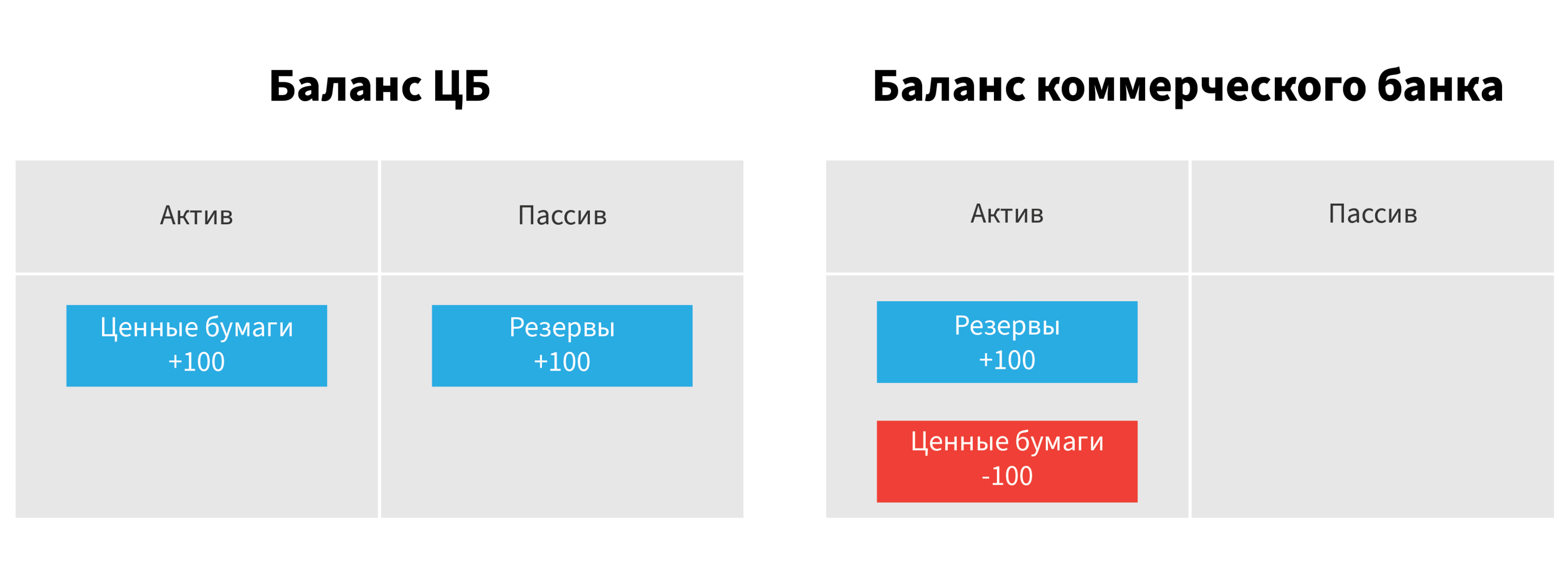 Центральный банк может кредитовать банки, создавая средства на их корреспондентских счетах. Он также может покупать активы — валюту, золото (золотовалютные резервы), облигации правительства на вторичном рынке, недвижимость. В результате на корреспондентских счетах банков, либо их клиентов, которые продали эти активы, появляются новые деньги.